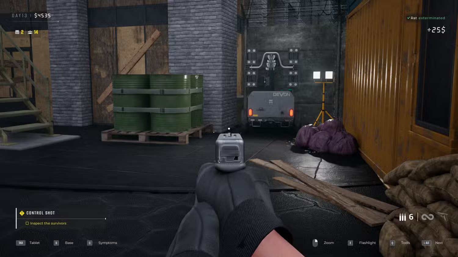 Крыс не так много, так что придется прогуляться по всем территориям. Заранее приготовьте молоток. Убивать их молотком сложнее, чем из пистолета. Проверяйте 1-2 выживших, затем идите на осмотр территорий. Повторяйте, пока не убьете 3 крыс.