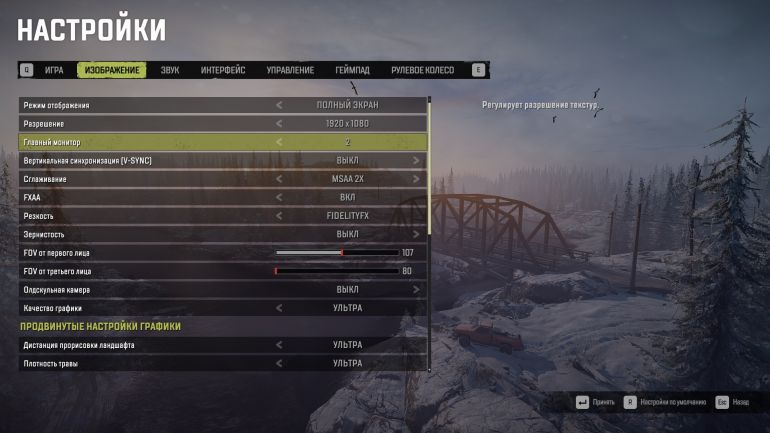 В игре около 15 настроек, напрямую влияющих на производительность. Есть готовые пресеты: от низкого качества до ультра. В целом SnowRunner неплохо выглядит даже на минимальных настройках, не говоря уже о средних. Пресет со средним качеством мы бы рекомендовали для большинства пользователей с ПК чуть лучше минимальных системных требований. А для более дотошных как всегда разберем каждую настройку далее.
