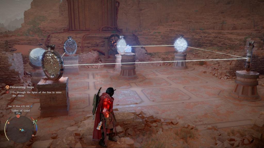 Теперь нужно перенаправить свет через зеркала к югу от Солнечного Шпиля. Следуйте за синим светом к следующему набору зеркал, снаружи Шпиля, на юге от него. Эта головоломка намного сложнее первой.