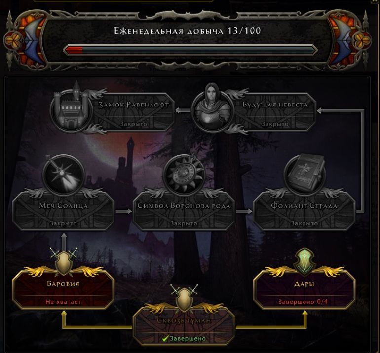 Кампания Равенлофта открывается для персонажей 70 уровня. Чтобы ее начать, найдите лорда Неверембера в Протекторате и выполните задание «Непрошеные гости». Завершив задание, вы попадете в Баровию, где сможете выполнять активности Равенлофта. Схема прохождения кампании выглядит следующим образом: