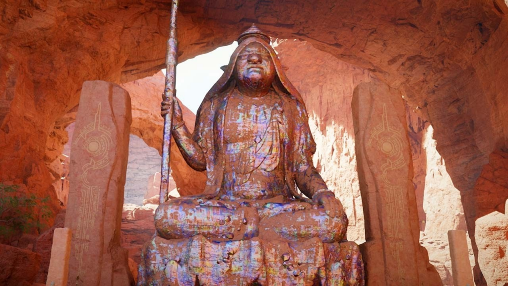 Вам нужно запрыгнуть на верхнюю часть большой статуи, отмеченной маркером. Встаньте на ее ноги и посмотрите на живот. Затем используйте «Фокусировку» (клавиша X) и зарядите «Удар пальмары: Фокусировка» (в режиме фокусировки нужно зажать колесико мыши, будто вы готовите обычный удар пальмары). В центре статуи появится золотой светящийся шар, в который нужно попасть способностью «Удар пальмары: Фокусировка».