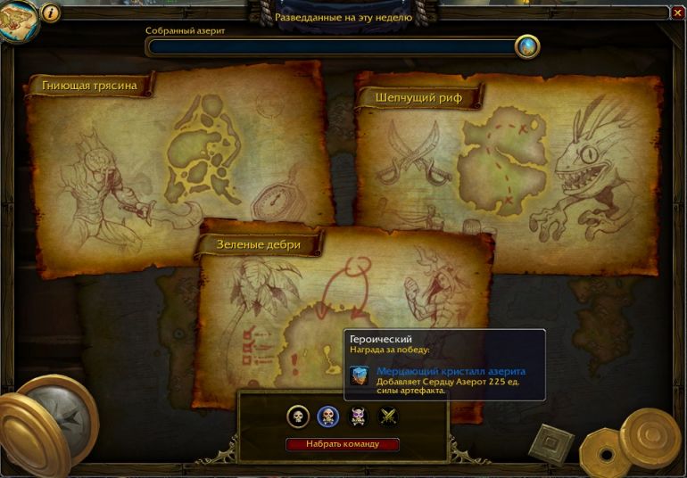 - Прогресс еженедельного квеста: в самом верху Карты экспедиции находится полоса, показывающая собранный на данной неделе азерит. Для того, чтобы выполнить задание, необходимо собрать 40000. Как только полоска заполнится, вы получите награду, отмеченную в ее конце. Если вы не успеете завершить задание в течении недели, весь собранный азерит перенесется на следующую. Так будет происходить до тех пор, пока задание не будет выполнено. В этом случае на новой неделе счетчик задания сбросится до нуля, и награду можно будет получить снова.