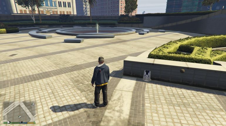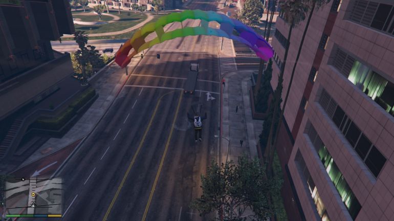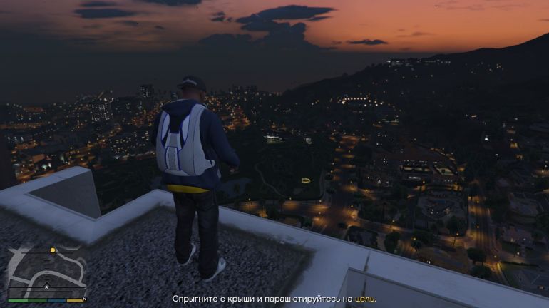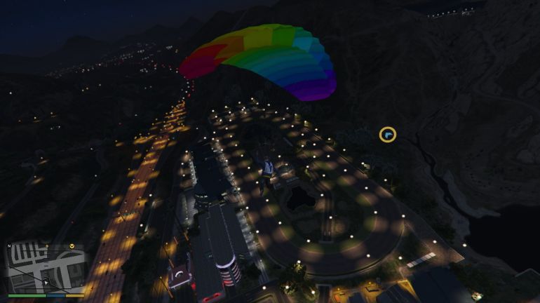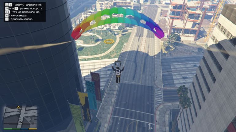Отправляйтесь к башне Maze Bank и подберите парашют, около главного входа. Когда задание начнётся, вы окажетесь на крыше Maze Bank верхом на Bati 801. С мотоцикла можно слезть и прыгнуть без него, но это не так интересно, правда? Жмите на газ, спрыгивайте с мотоцикла и раскрывайте парашют. Цель находится севернее и приземлиться надо на газон, а не на движущуюся цель. Раскрыть парашют можно сразу, чтобы спокойно долететь до точки приземления.