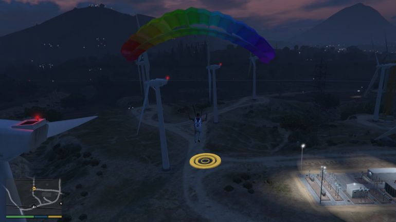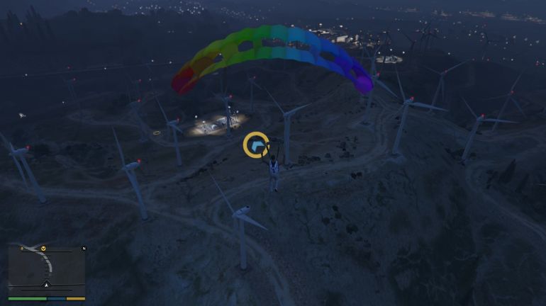 Отправляйтесь к полю с ветрогенераторами и садитесь в вертолёт. Когда прыгнете, вам нужно будет пролететь через несколько чекпойнтов и приземлиться в заданной точке. Старайтесь не отклоняться от маршрута, чтобы не задеть лопасти ветряков.