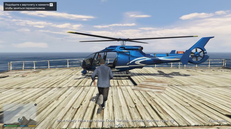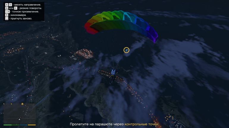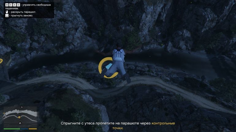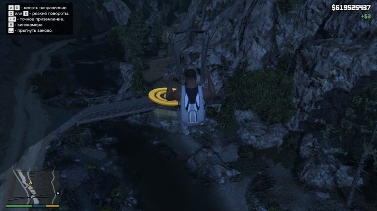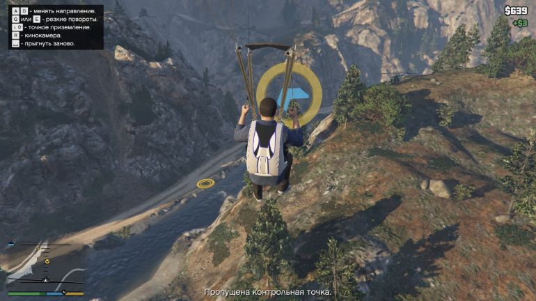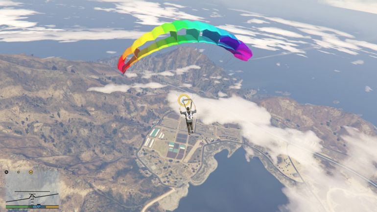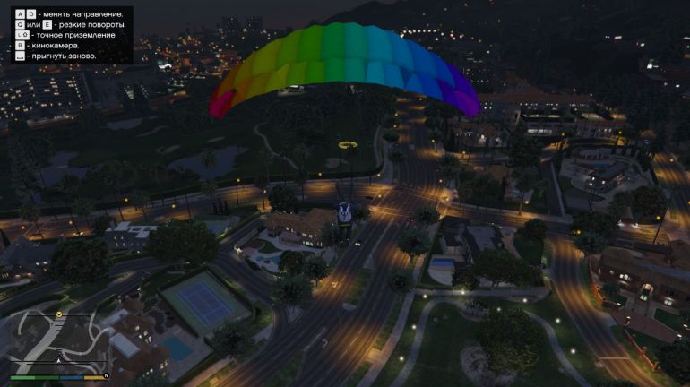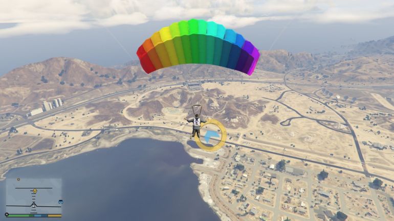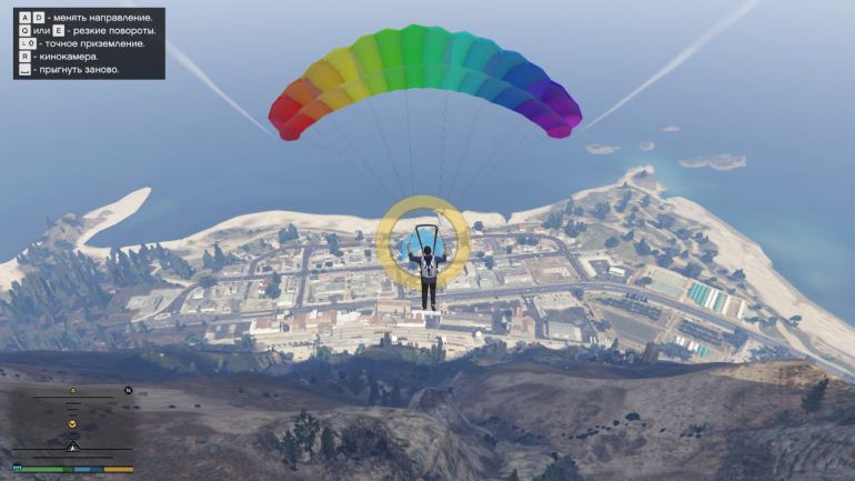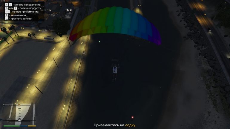 Чтобы выполнить первый прыжок, направляйтесь к пристани в Ла-Пуэрта. Эту пристань можно купить (если она ещё не куплена) для того, чтобы сохранять там водный транспорт. На парковке возле пристани будет стоять Maverick. Подходите к нему и жмите E (треугольник на PS или Y на Xbox). Когда окажетесь в воздухе, нажимайте Пробел/Квадрат/X, чтобы выпрыгнуть. Наша задача приземлиться на катер в проливе. Катер медленно движется вперёд, поэтому нужно рассчитывать так, чтобы догнать катер, но не пролететь мимо. Сначала спуститесь поближе к катеру, а затем раскрывайте парашют. Если спуститься совсем низко, то катер догнать не получится. Раскрыв парашют, аккуратно планируйте на катер. Если чувствуете, что пролетите мимо, то стоит спикировать вниз, нажав W или наклонив стик вперёд. Если не дотягиваете, то нажимайте S или стик к себе. Точное приземление используйте уже перед посадкой, чтобы аккуратно приземлиться на катер.