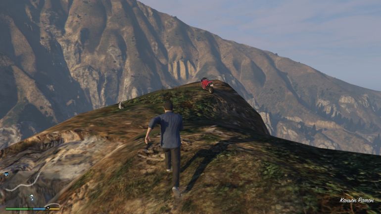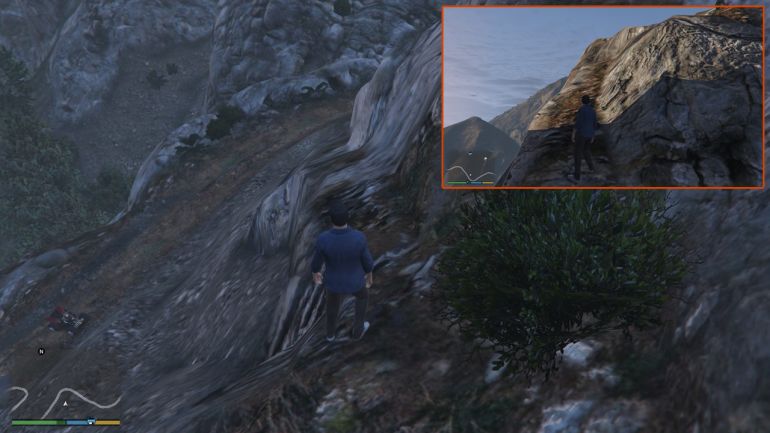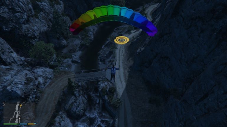 Прыжок расположен на вершине скалы в каньоне Ратон. Несмотря на то, что скала кажется неприступной, вам необязательно прилетать туда на вертолёте. Со стороны дороги, есть незаметная тропинка, по которой можно подняться наверх. Берите парашют и начинайте прыжок. Если вам понравилось прыгать с Maze Bank на мотоцикле, то рядом стоит всё тот же Bati 801. Когда прыгните, не открывайте парашют пока не пролетите первый чекпойнт. После прохождения чекпойнта, раскрывайте парашют, проходите второй чекпойнт правее и приземляйтесь в указанной зоне.