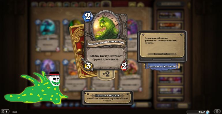 Кислотный слизнюк — «Слизнюки обожают фламенко. Не спрашивайте, почему». В оригинале: «Oozes love Flamenco. Don’t ask». После прочтения строк сознание словно переселяется в тело Шелдона Купера из сериала «Теория большого взрыва». который призывает на помощь шапочку-смекалочку. Так и не нашедшему ответ на вопрос Шелдону, как всегда приходит на помощь Леонард Ховстедтер в лице старшего дизайнера Hearthstone Бена Рода и он отвечает в своем твиттере . В альфа версии Hearthstone это был арт-рисунок художника Дэна Нгуена, на котором изображен слизнюк в испанской шляпе для танцев фламенко.