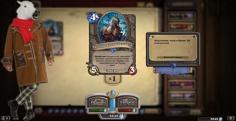 Бронированный скакун — «Подумаешь, конь в броне. Не в пальто же». В оригинале: «Yep. It's a horse…wearing armor…going to war». В описании карты явный намек на знаменитую присказку из русского народного фольклора — «Конь в пальто», которую часто используют в качестве шутливого ответа на вопрос заканчивающийся местоимением «Кто?». Оригинальная фраза звучит так: «Ага. Это лошадь… Носящая доспехи… собирающаяся на войну».
