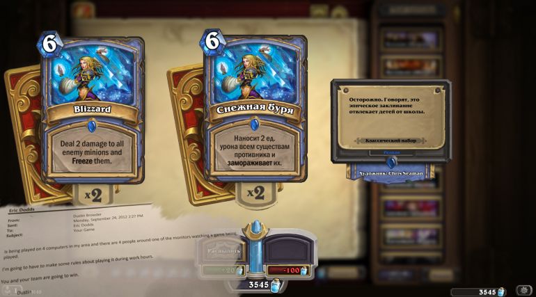Снежная буря — «Осторожно. Говорят, это эпическое заклинание отвлекает детей от школы». В оригинале: «This spell can be very Entertaining». Для того, чтобы понять сущность шутки и доли самокритичности, нужно обратить внимание на оригинальное название карты: «Blizzard» — в переводе на русский язык звучит, как метелица или снежная буря. Более того, на ранней стадии тестирования внутри студии игра пользовалась дикой популярностью среди сотрудников Blizzard. Доходило до того, что часть сотрудников играла часами на пролет или наблюдала, как другие играют. Дастин Броудер (Dustin Browder), ведущий проектировщик StarCraft 2, обратился в письме к Эрику Доддсу (Eric Dodds), главному разработчику Hearthstone, с просьбой ввести ограничения по поводу игр в рабочие часы.