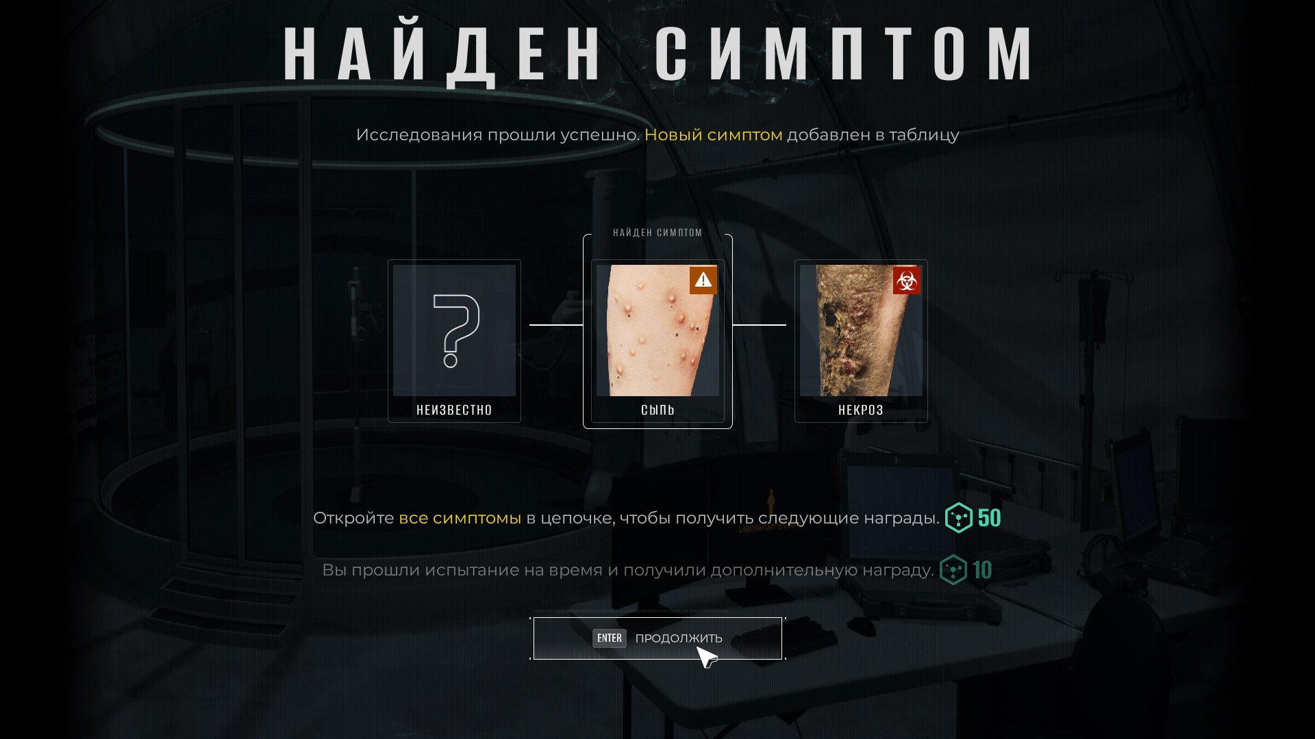 Самым первым выжившим будет человек с неизвестным симптомом. Откройте планшет, выберите неизвестный симптом и отправьте его в лабораторию.