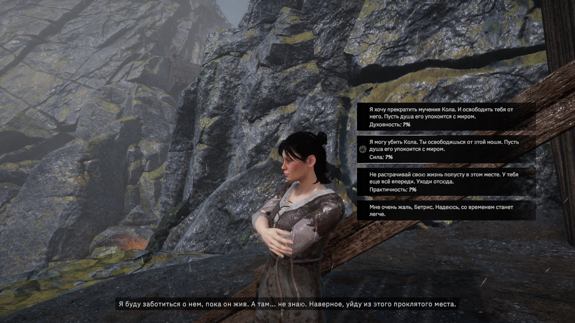 На этом этапе можно принять еще одно решение. Если у вас хорошо прокачана сила, духовность или практичность, попробуйте убедить Бетрис в том, что нужно «прекратить мучения Кола». Успешное убеждение принесет немного золота и дополнительные очки опыта. Ночью убейте Кола и поговорите с Бетрис.