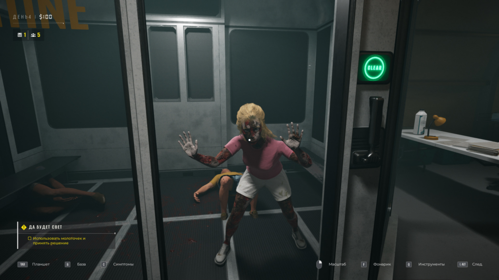 С этого дня вам доступна клетка, в которую вы можете отправлять зомби. Чтобы получить зомби, нужно отправить зараженного человека в карантин (или со спорными симптомами). Когда в карантине появится зомби, подойдите и взаимодействуйте именно с ним (как проводите дополнительную проверку), чтобы появилась надпись «К клетке».
