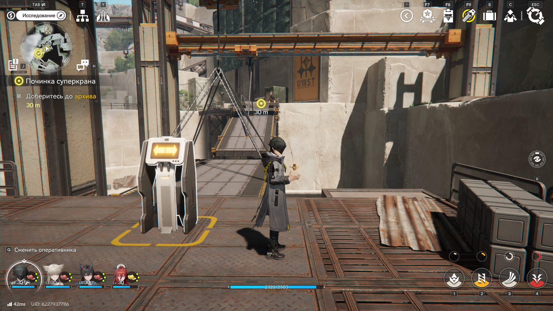 Закончив со всем, телепортируйтесь на центральный подъемник и езжайте вверх к панелям управления суперкрана. Отремонтируйте панель электрического нексуса.