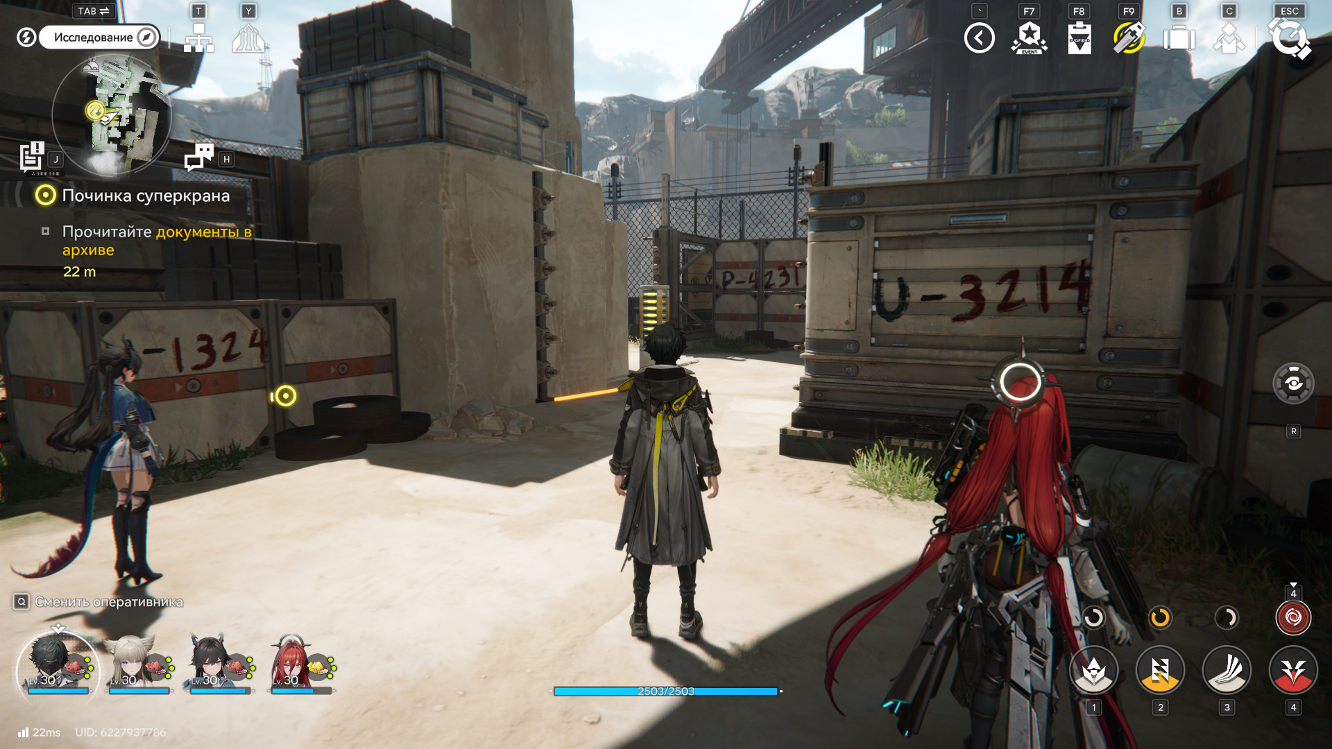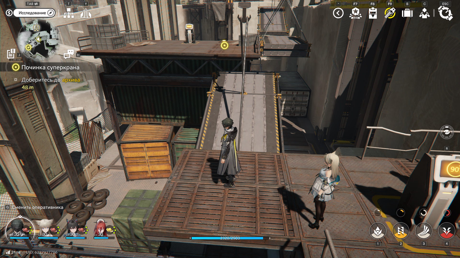 Выйдите на платформу и взаимодействуйте с правым терминалом, чтобы проехать вперед и вниз. Внизу подберите Аурелин и идите по маркеру. Уничтожьте всех врагов и откройте большие ворота справа при помощи терминала. Вы создадите короткий путь к месту, откуда сюда пришли. Также можете поднять ящик на погрузчике и запрыгнуть к ресурсам.
