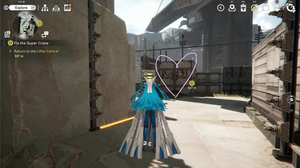 Выйдите на платформу и взаимодействуйте с правым терминалом, чтобы проехать вперед и вниз. Внизу подберите Аурелин и идите по маркеру. Уничтожьте всех врагов и откройте большие ворота справа при помощи терминала. Вы создадите короткий путь к месту, откуда сюда пришли. Также можете поднять ящик на погрузчике и запрыгнуть к ресурсам.