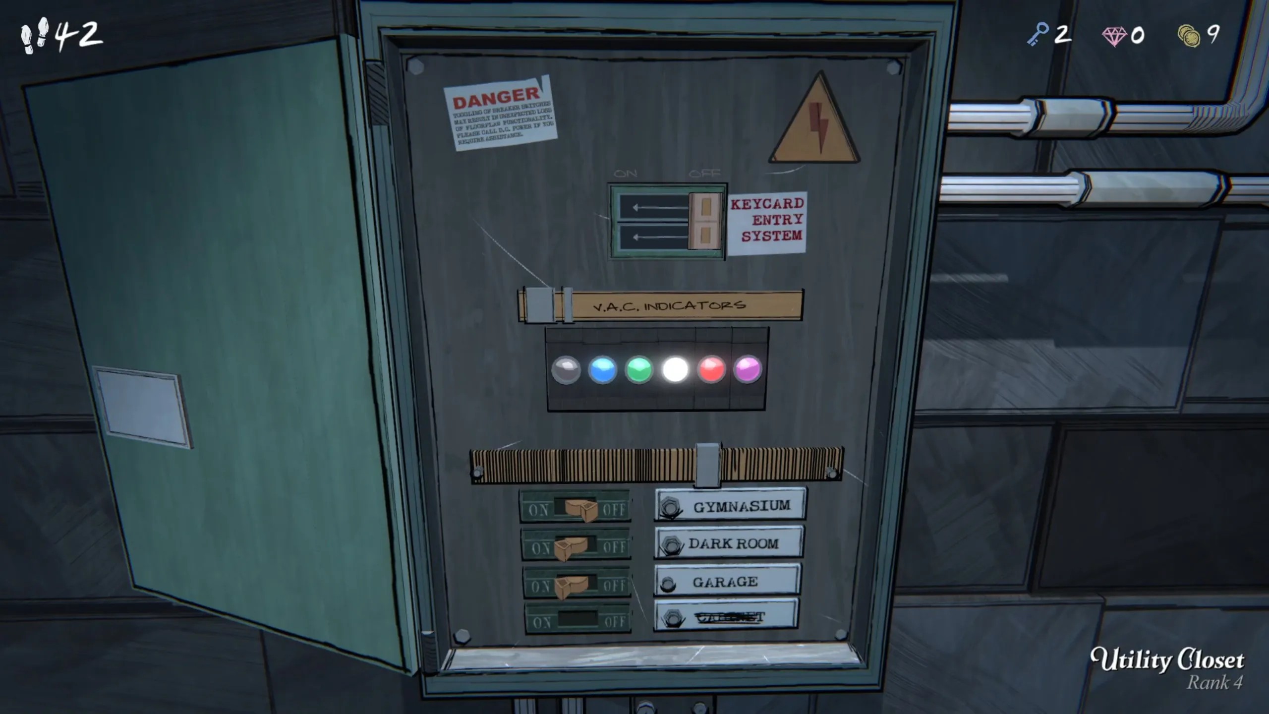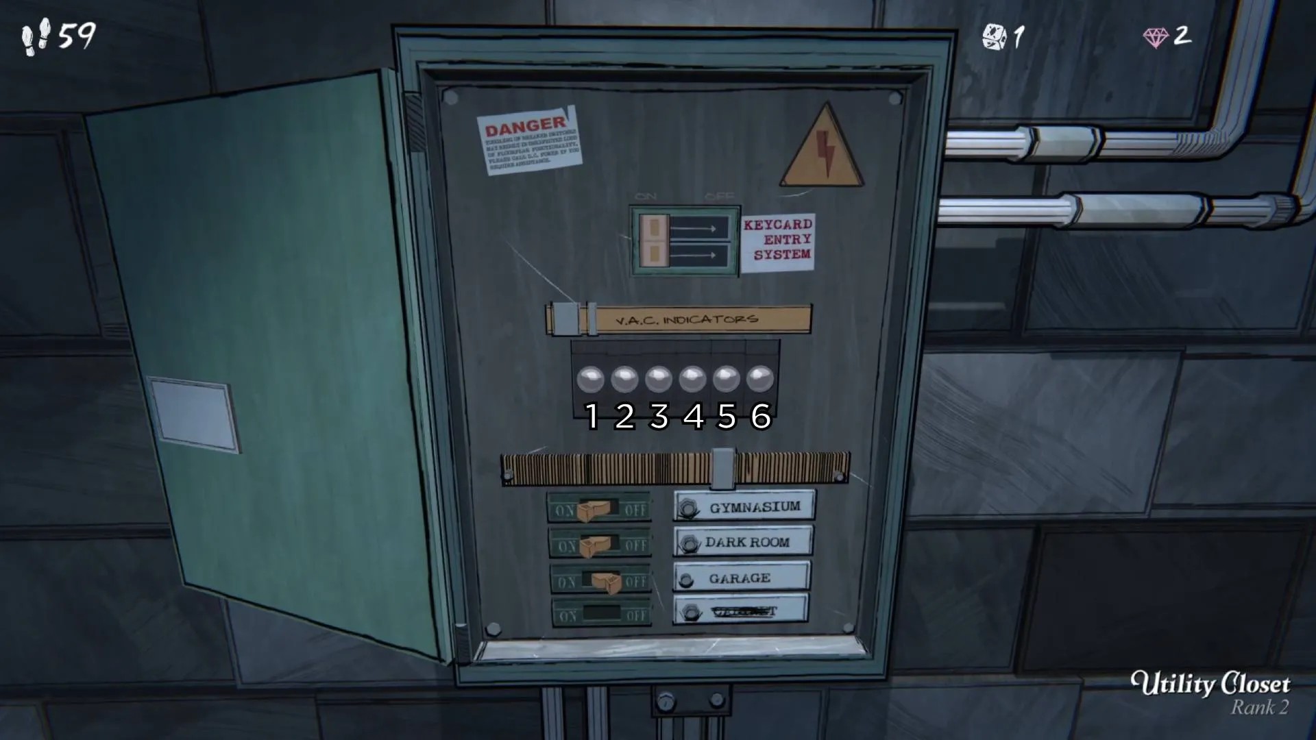После выполнения перечисленных действий индикаторы V.A.C. на щитке должны выглядеть как на скриншоте выше, и стена поднимется до потолка. Откроется электрический щиток. Взаимодействуйте с электрическим щитком, чтобы разблокировать алмазы — постоянное улучшение, которое позволит начинать день с 2 алмазами.