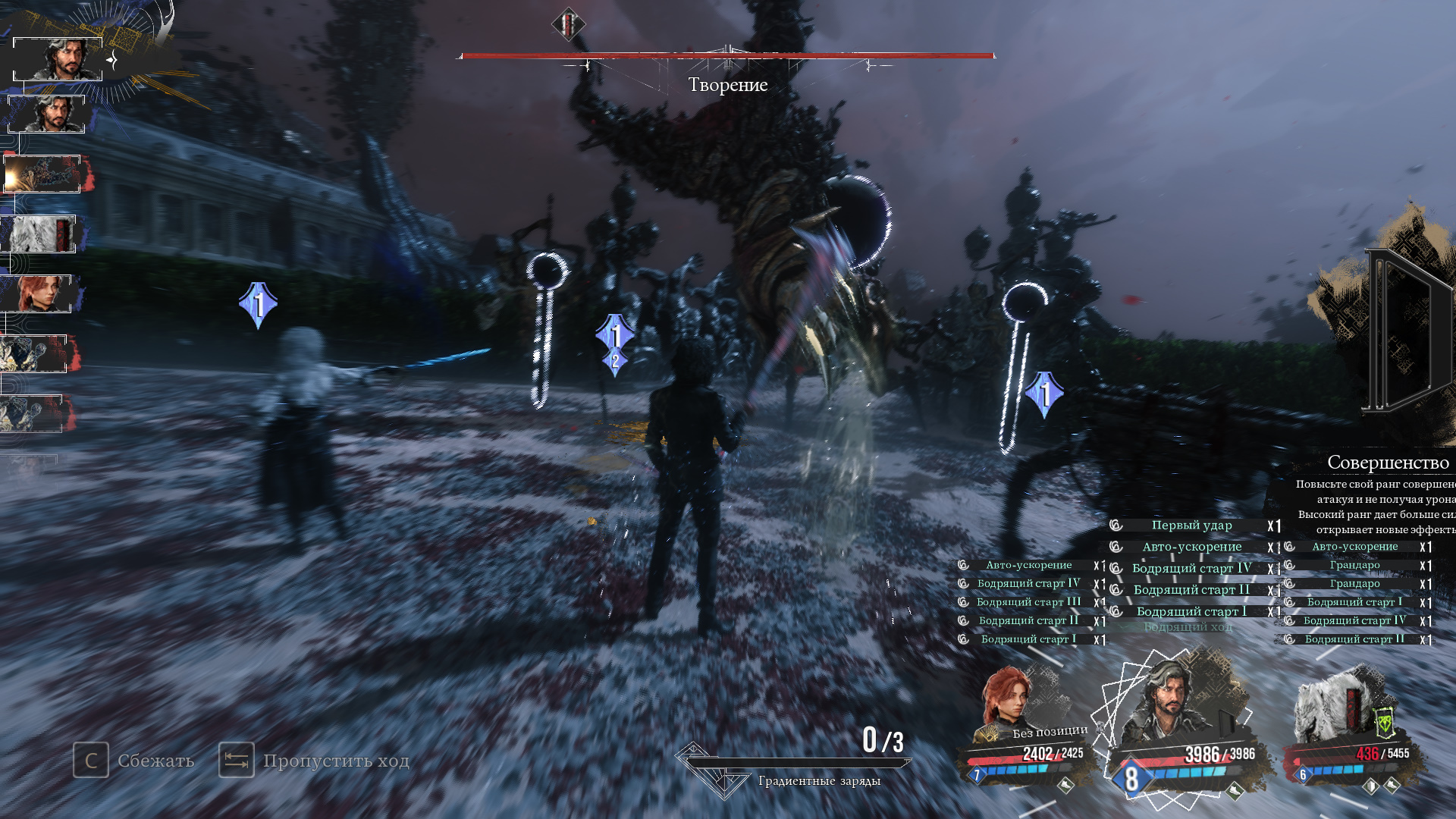 Чтобы продолжить путь, нужно победить Творение. В целом ничего сложного, поскольку к этому моменту у вас уже должны быть хорошо прокачанные бойцы. Изучите паттерны и быстро победите. И не забудьте взять в команду Моноко, поскольку вы можете получить ногу творения. За победу также получите пиктос «Быстрота без силы» (всегда два действия подряд, но урон снижается на 50%). Смысла в пиктосе особого не вижу, поскольку на два хороших навыка у вас попросту не хватит очков, да и зачем разделять урон.