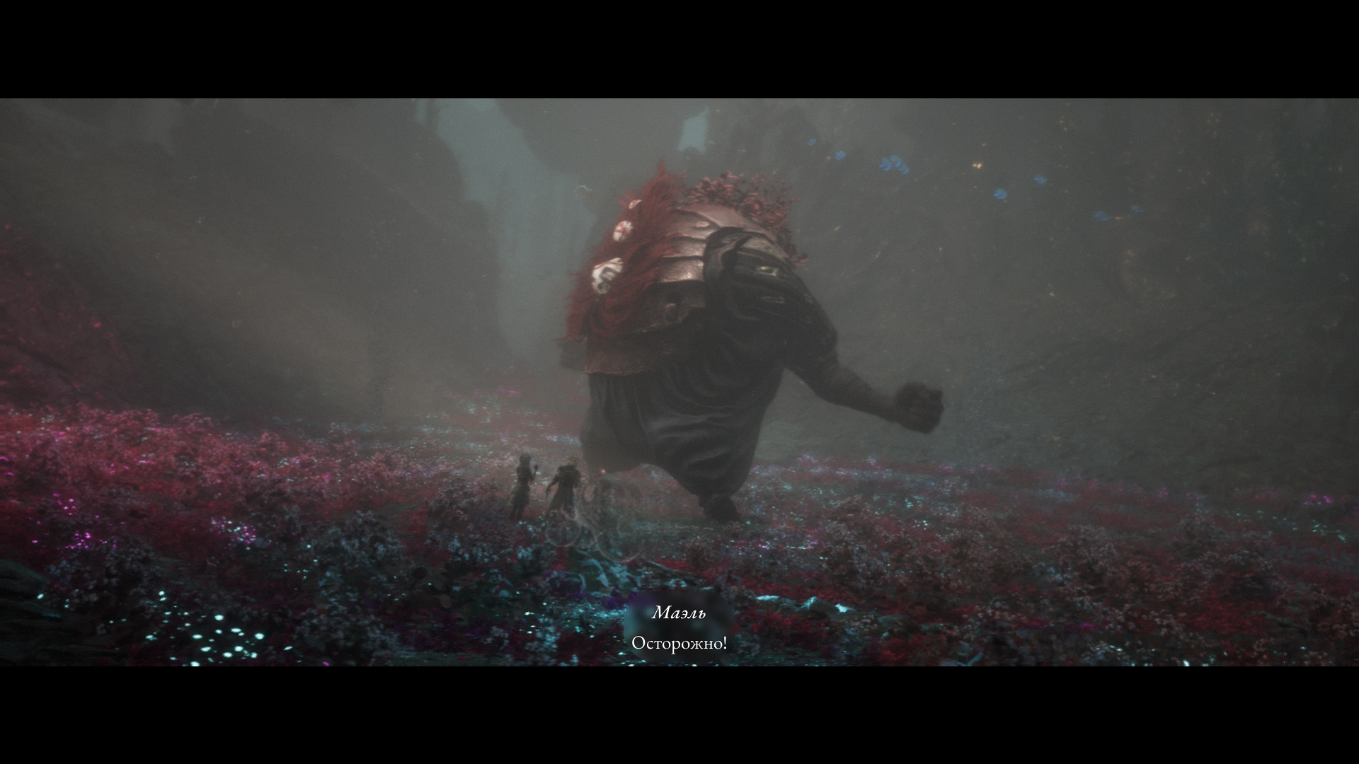 Продолжайте движение вглубь локации. Когда увидите огромного монстра и справа точки для зацепа, не спешите и пройдите чуть левее них. За водорослями есть другой набор зацепов, который ведет к опциональному боссу Миму с красными волосами. За победу вы получите новую причёску для Маэль «Короткая стрижка».