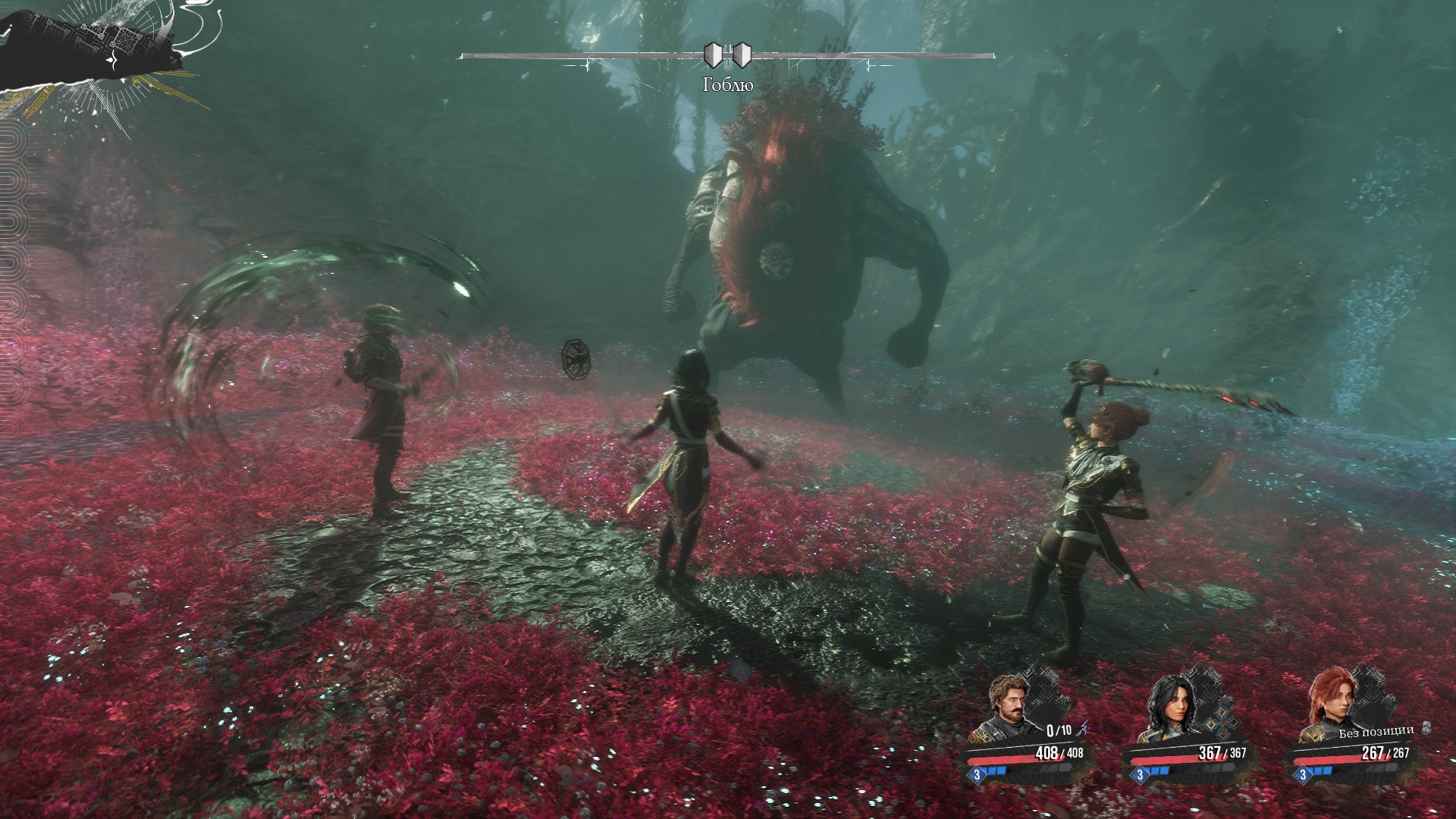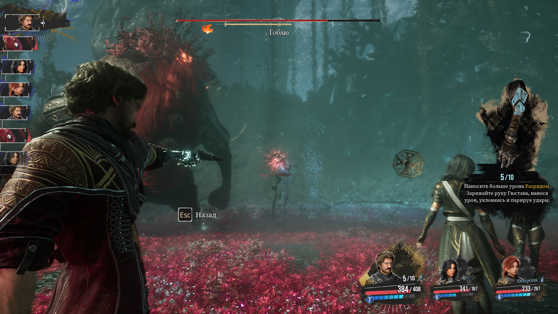 Прыжок Гоблю наносит легкий урон всей группе. Его можно парировать или уклониться, но не перепрыгнуть. Не путайте с атаками, которые, наоборот, требуют прыжка! Комбо из двух ударов легко парируется, главное поймать нужный ритм. Два удачных парирования к ряду позволят выполнить мощный контрудар.