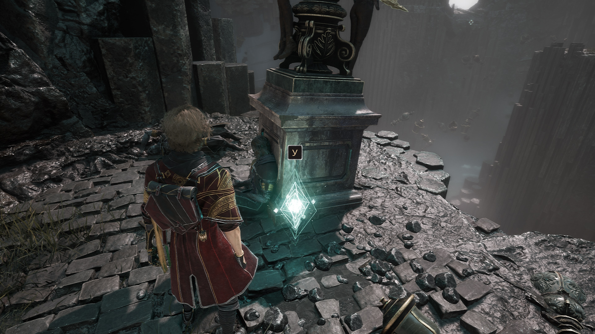 Наконец, идите в самый конец справа и найдите третий скальный кристалл. По мере приближения выпрыгнет Утес. Победите и получите второй скальный кристалл. Чуть дальше есть веревка, уходящая вниз. Спуститесь, слева ищите ретушь. Здесь вы встретите Золотую шевальерку, охраняющую еще одну дверь Особняка. Она устойчива к огненному и ледяному урону. С нее выпадет новый пиктос «Опасное парирование» (+1 ОД при парировании, но полученный урон удваивается).