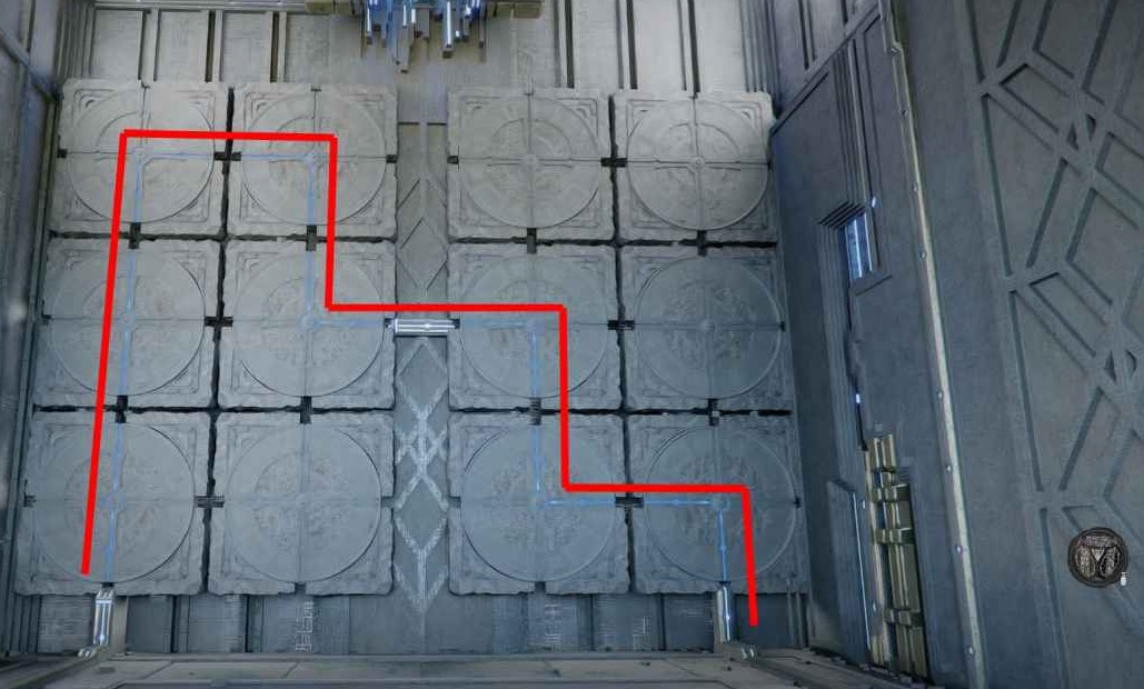 На верхнем этаже у лифта необходимо перенаправить питание. Не взаимодействуйте с батареей в стене ниже, она установлена ​​в правильном месте и подает питание на верхний этаж. Питание должно идти от левой нижней панели (диска), куда входит синий провод/линия, до правой нижней панели той же стены. Удерживайте CTRL + ЛКМ (Отражение Света), чтобы видеть линии питания, скрытые внутри панелей. Также их можно подсветить фонарем (включите фонарь, затем удерживайте CTRL). Хватайтесь за панели с помощью Силы Аксиомы и перемещайте мышь, чтобы их вращать. Начните с левой нижней панели и закончите правой нижней.