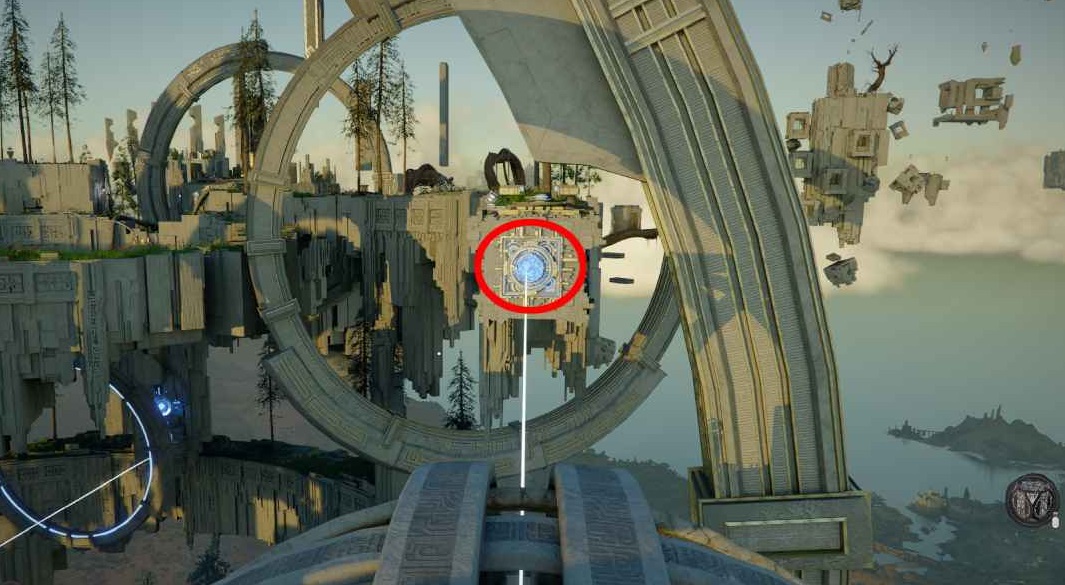Платформа посередине поднимется на следующий этаж. Убедитесь, что успели на нее взобраться! Снова летите вверх на потоке воздуха от турбины. Встаньте на платформу, и увидите большую круглую панель с синими глифами посередине (по сути, огромный диск). Чтобы настроить этот диск правильно, нужно повернуть его Силой Аксиомы дважды вправо или влево (на 180 градусов).