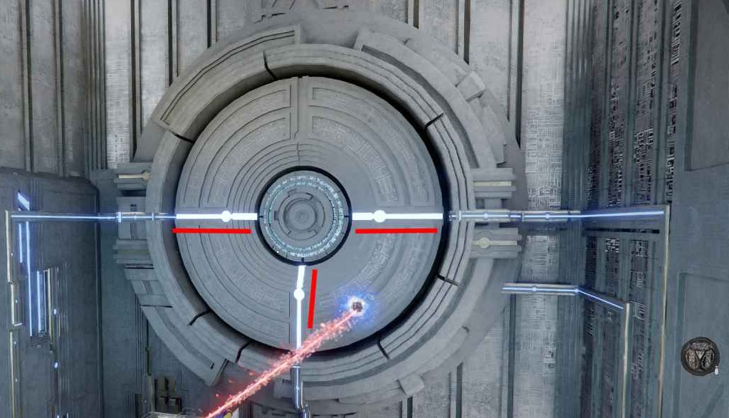 Если вы все сделаете правильно, то все большие кольца станут синими и начнут вращаться. С двумя средними устройствами (нижним и верхним) взаимодействовать не нужно, их лучи уже направлены на приемники, оттого в начале эпизода вы видите, как вращаются два синих кольца по центру. вы случайно взаимодействовали с ними и направили лучи куда-то в другое место, то придется перенаправить их обратно на приемные кристаллы, пока они не станут синими. Таким образом, в общей сложности все 4 лазерных луча должны быть направлены на 4 приемных кристалла.