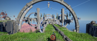Заберитесь по активированной настенной панели и следуйте к маркеру. Пройдите через Небесные врата (треугольное сооружение), чтобы из земли появился столб. Все как обычно: используйте на нем Силу Аксиомы, затем поверните до упора клавишей A или D, пока он не станет синим. Подождите несколько секунд, чтобы появились платформы. Активируется Небесный путь.