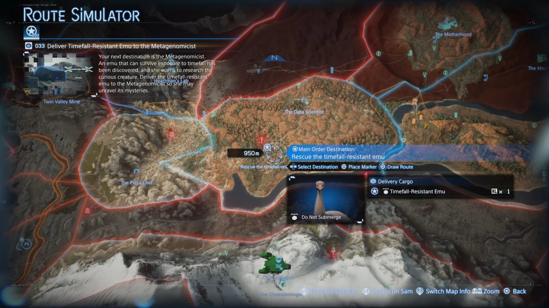 Первая часть задания связана с поиском и поимкой загадочного эму, устойчивого к хиральному дождю. Это лишь половина маршрута. Для начала отправляйтесь к месту, где животное видели в последний раз — примерно в 950 метрах к северу от Хронобиолога. Можно спуститься с горы и пересечь широкую реку, но в этом нет необходимости. Вместо этого лучше воспользоваться быстрым перемещением на DHV «Магеллан» и переместиться к Аналитику.