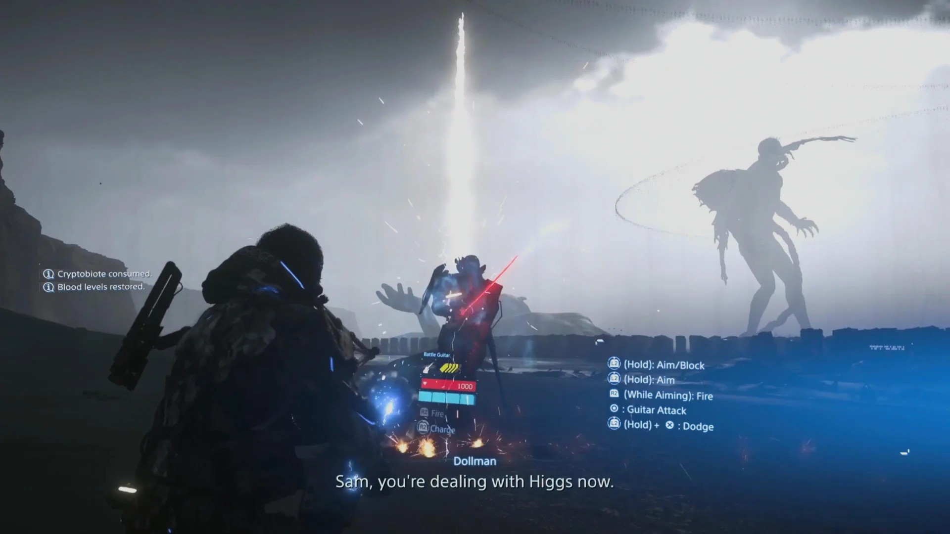 Как и в боях с Нилом Ваной, Хиггс будет телепортироваться. В этот момент появится гигантская Тварь, который начнет ему помогать. Игнорируйте монстра и сосредоточьтесь на Хиггсе, сканируя L1 и уклоняясь от атак.