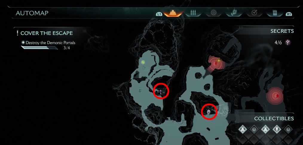 Вы попадете в большую открытую область, и задание обновится: вас просят закрыть 4 демонических портала. Идите по левой тропе, пока не доберетесь до капсулы с оружием, внутри которой находится «Шреддер» (вы подберете его по сюжету). После этого развернитесь и посмотрите налево. Увидите место, куда можно спрыгнуть. Спрыгните, подойдите к коллекционному предмету — вокруг него поднимется барьер. Повернитесь и выстрелите в бочки, чтобы уничтожить появившихся демонов, после чего сможете забрать скин для дробовика.