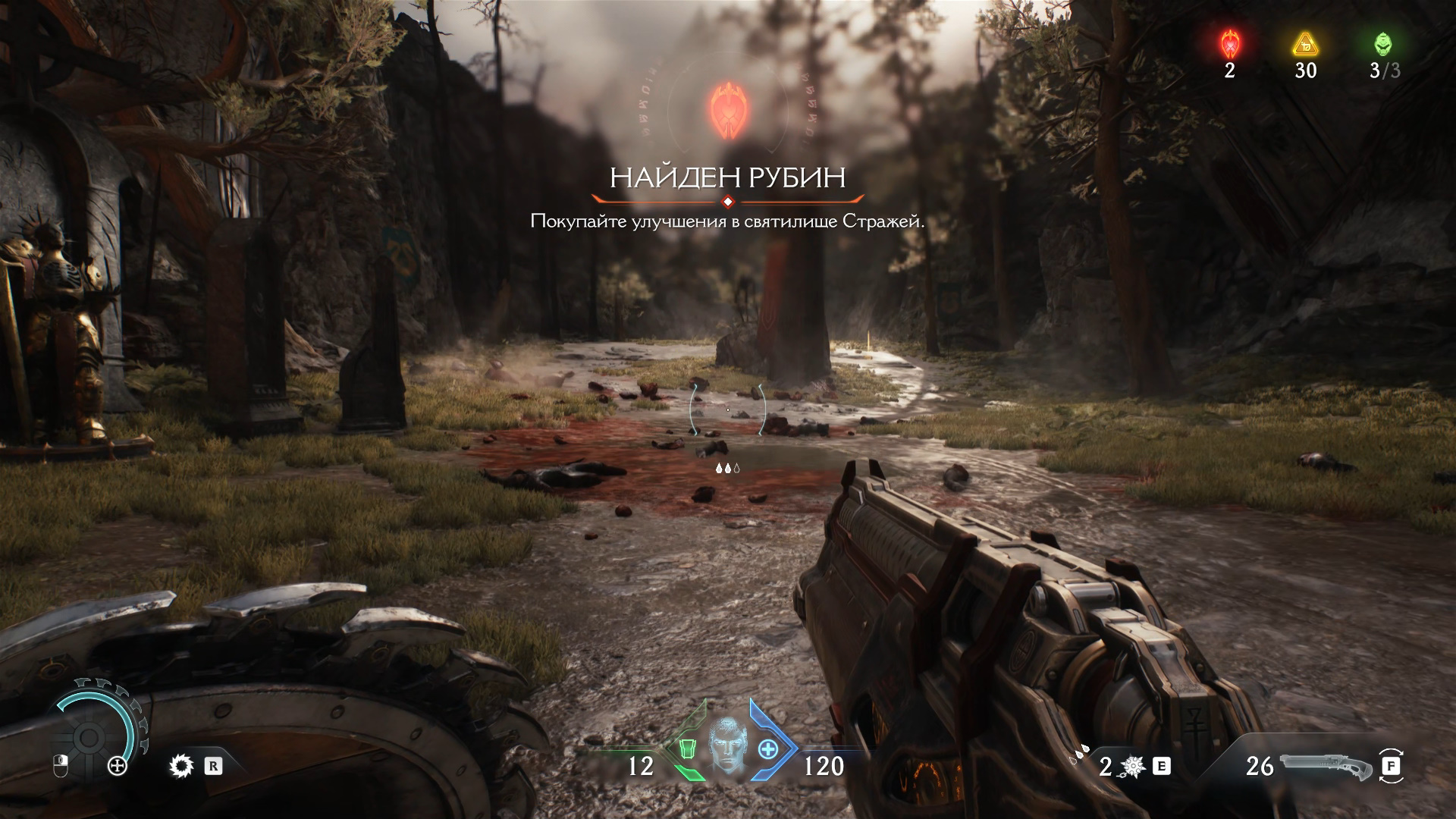 Идите вправо, чтобы обнаружить алтарь с зеленой печатью, который можно сломать рывком щита. Сделав это, вы попадете в засаду. Но как только победите всех врагов, сможете забрать со статуи рубин.