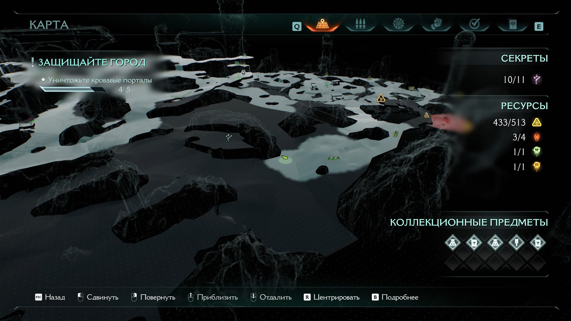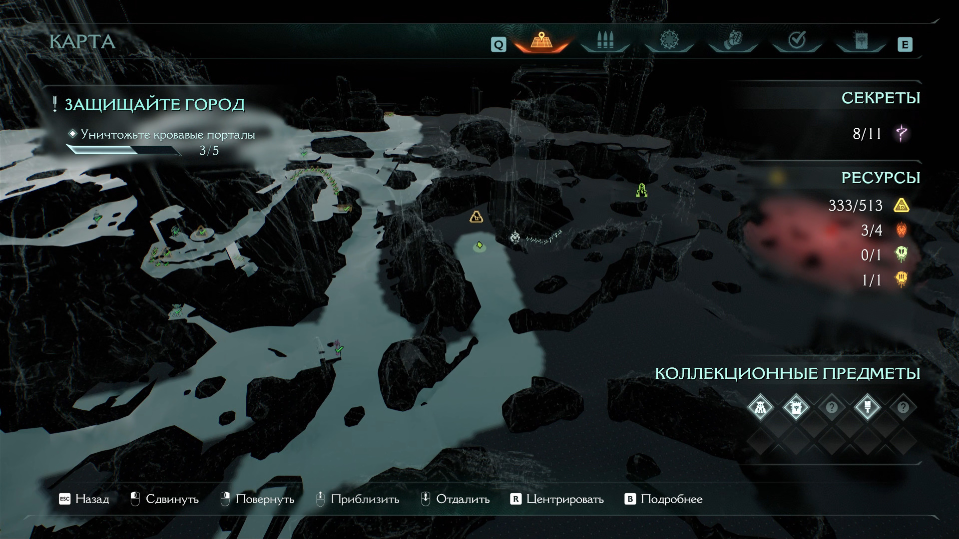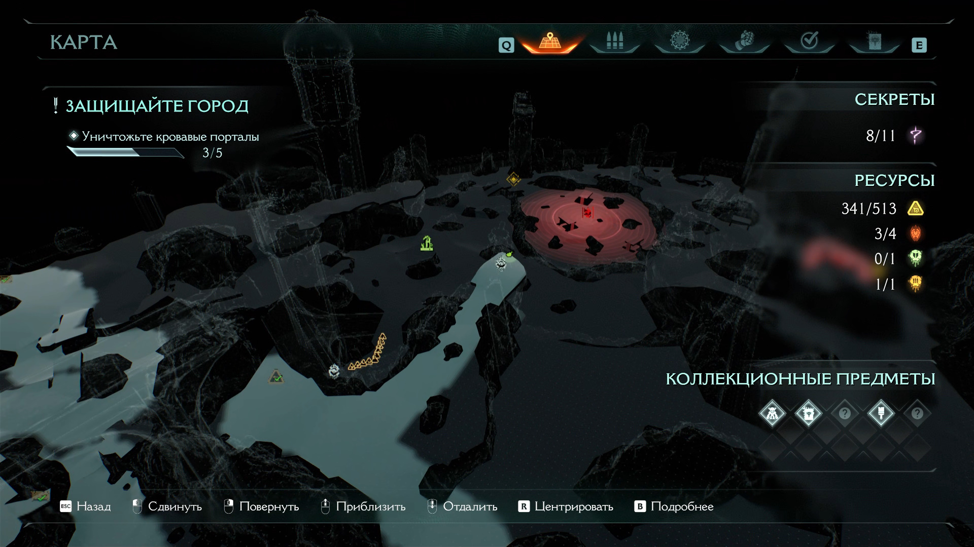 Идите в правую часть карты, где находятся еще два кровавых портала. Перед ними стоит святилище Стражей, третьей по счету. Активируйте его, откройте карту и обнаружите спуск с золотыми слитками и печатью жизни. Идите туда, опасайтесь щупалец, который появляются из-под земли. Соберите 9 слитков и печать жизни.