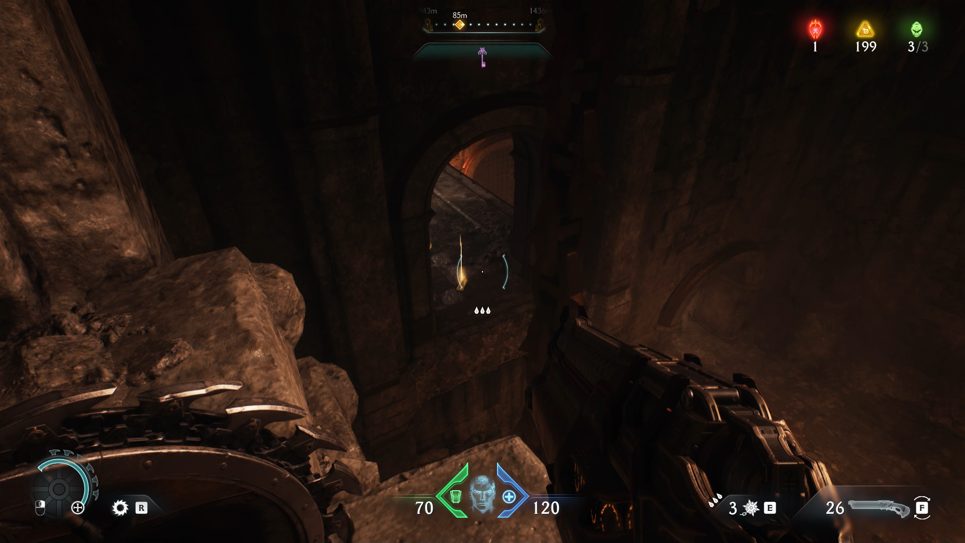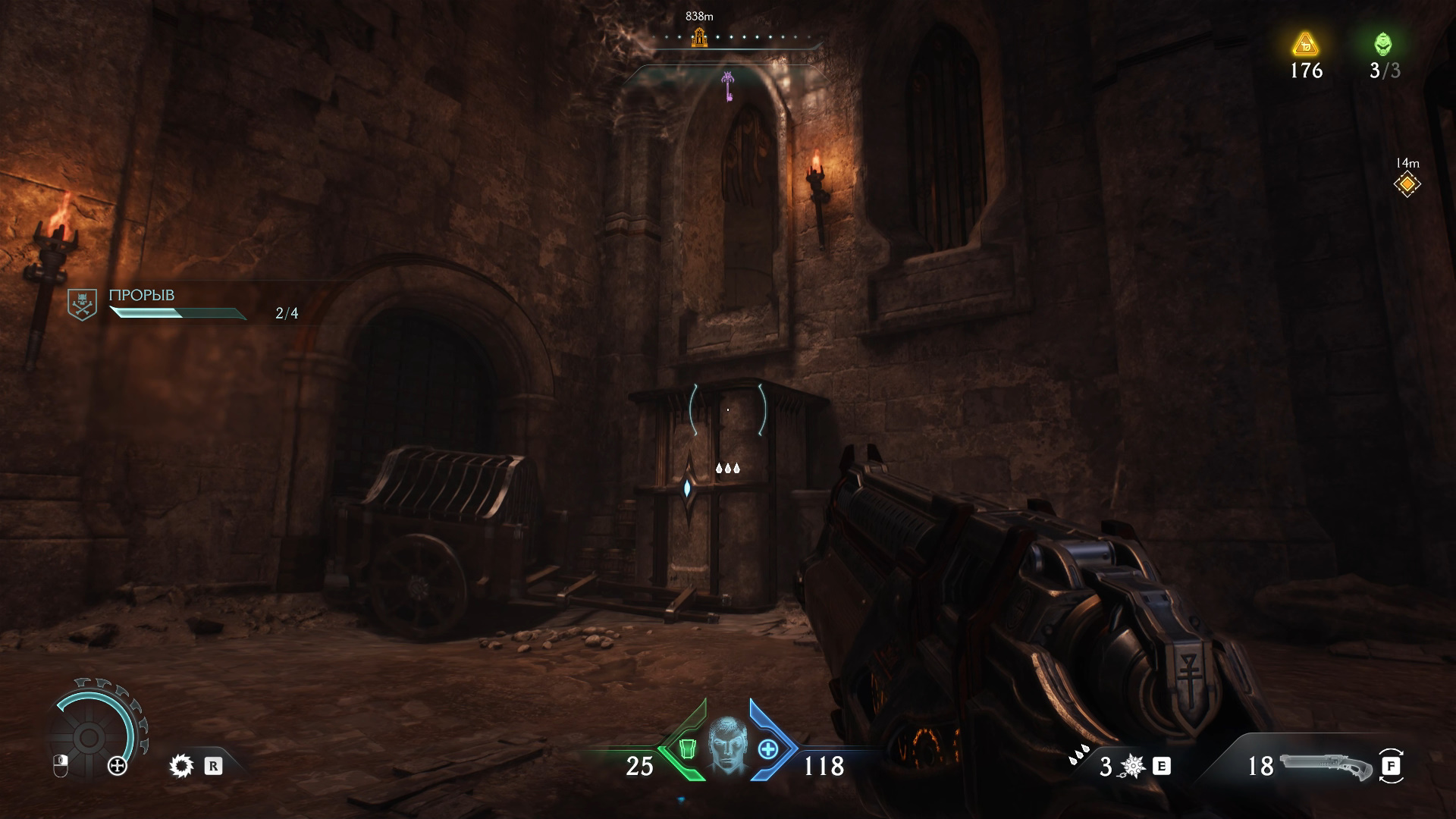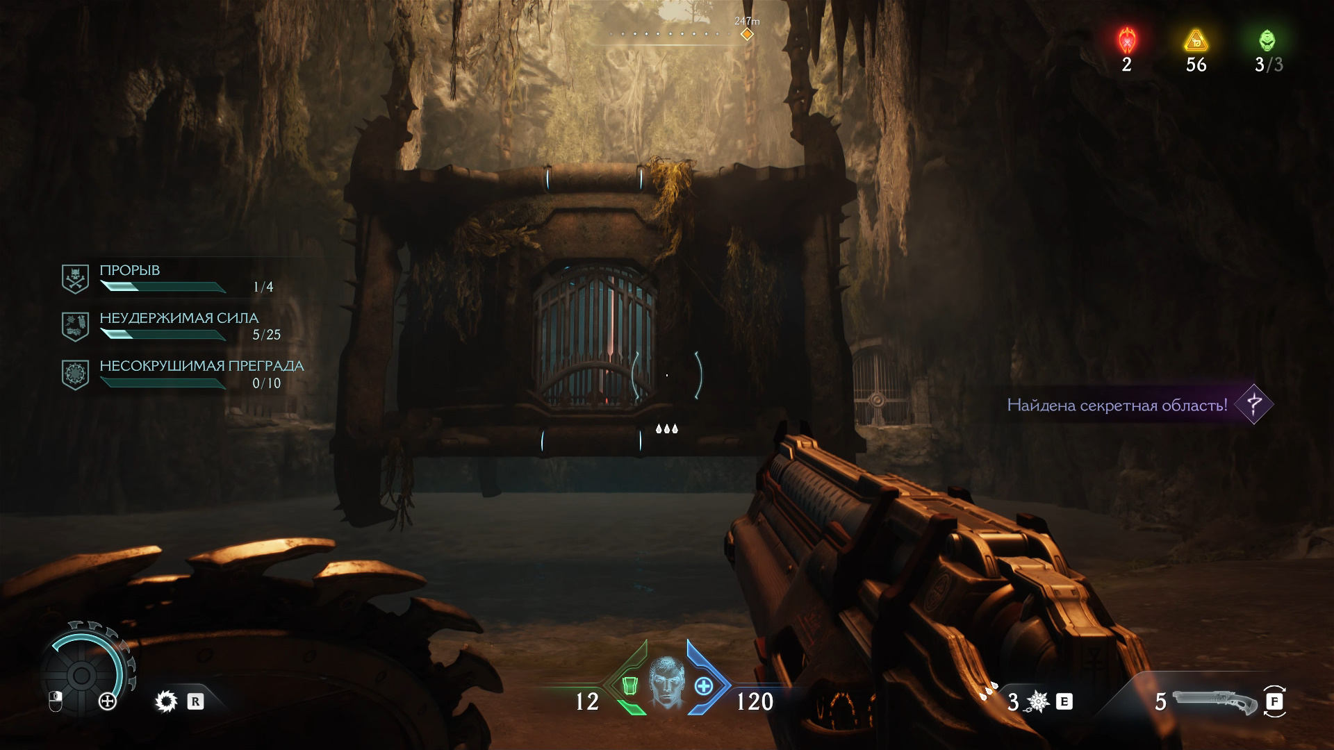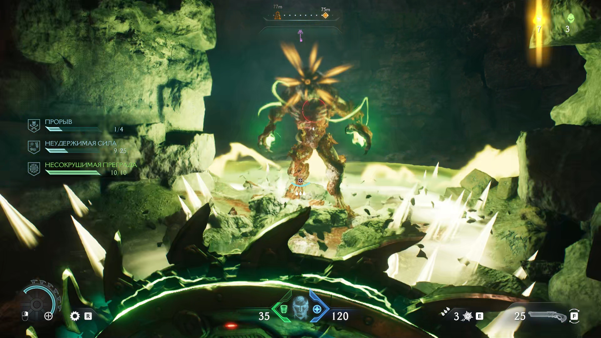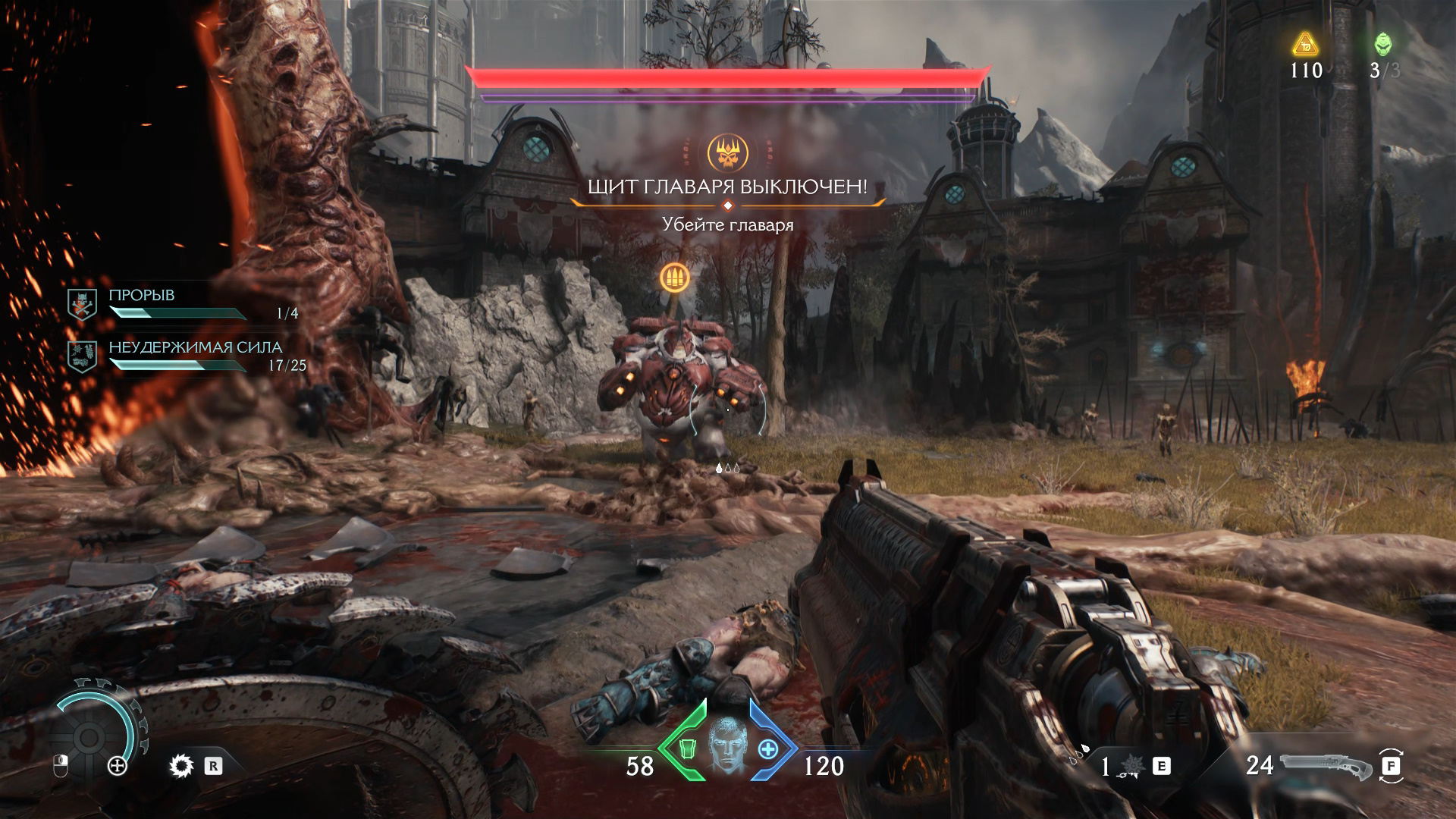 Рядом со вторым кровавым порталом в левом верхнем углу карты вас ждет первая стычка за боевой дух. Главарь демонов с сущностью окружен щитами, и чтобы их снять, нужно убить достаточное количество обычных и элитных мобов. Как только фиолетовая шкала под полоской здоровья опустеет, вы сможете убить демона и получить его сущность. Она повысит боезапас гвоздей до 2/3.