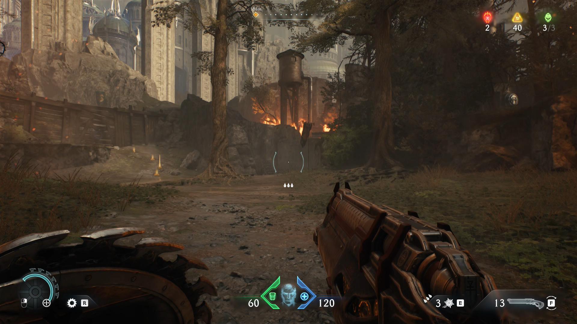 На первом повороте сверните влево и увидите пылающую водонапорную башню. Слева есть подъем с 4 золотыми слитками к разрушаемой стене. Уничтожив ее, разберитесь с демонами и разрушьте первую артиллерийскую пушку, что нужно в рамках побочного задания. После сможете подобрать еще 8 золотых слитков (на месте, где была пушка).
