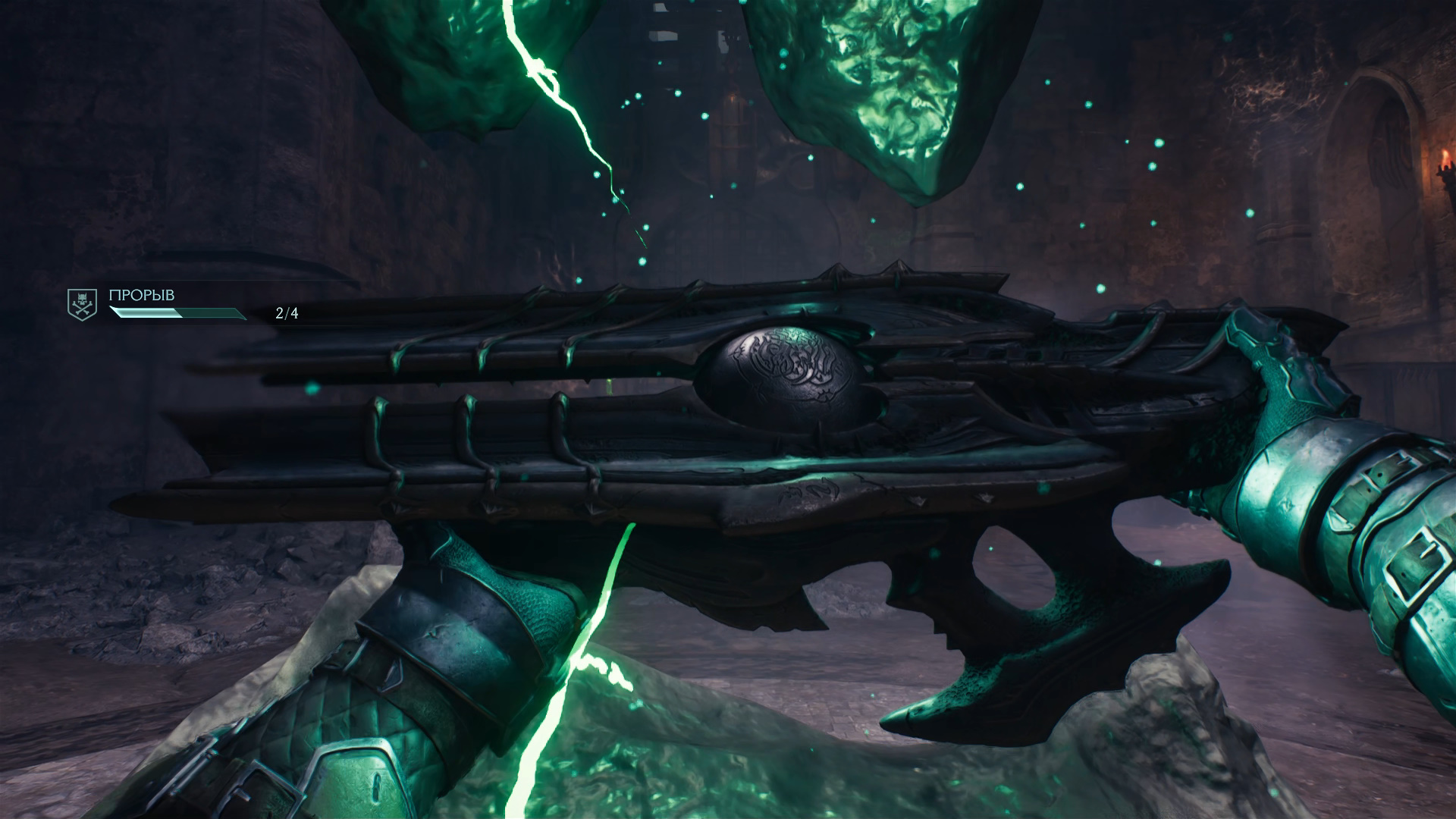 Выйдите отсюда и идите в другую сторону крепости. Разбейте стену, затем метните щит в подвешенный блок, чтобы разрушить цепь. Поднимитесь на упавший блок, развернитесь и метните щит в зеленую плоть. Притянитесь и рывком ударьте по доскам, чтобы создать мост. С разбега прыгните на неровную стену впереди, но не спешите.