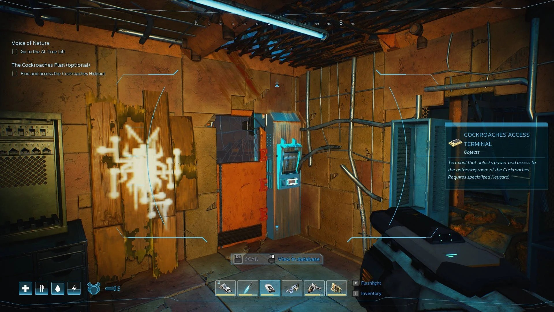 Открыв нижние уровни Мастерской и создав резак, вы получите доступ к самой нижней зоне. Исследуйте ее и найдите дверь с символом Сопротивления. Просканируйте терминал доступа с помощью сканера, чтобы получить чертеж ключа. Вернитесь сюда позже, откройте дверь и найдите USB-накопитель с вирусом, убивающим ИИ.
