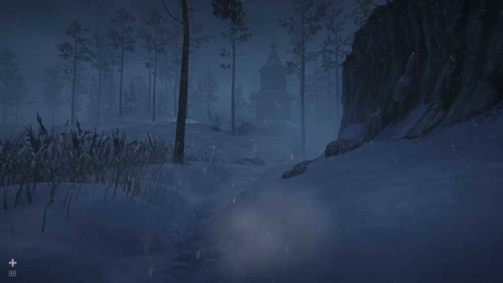 Обойдите капсулу и двигайтесь по тропинке к церкви. В основном помещении есть батарея для конденсатора. Еще одна комната окажется запертой, и нужен ключ. Выйдите из дома, двигайтесь через кладбище вниз, к деревне. Войдите в избу.