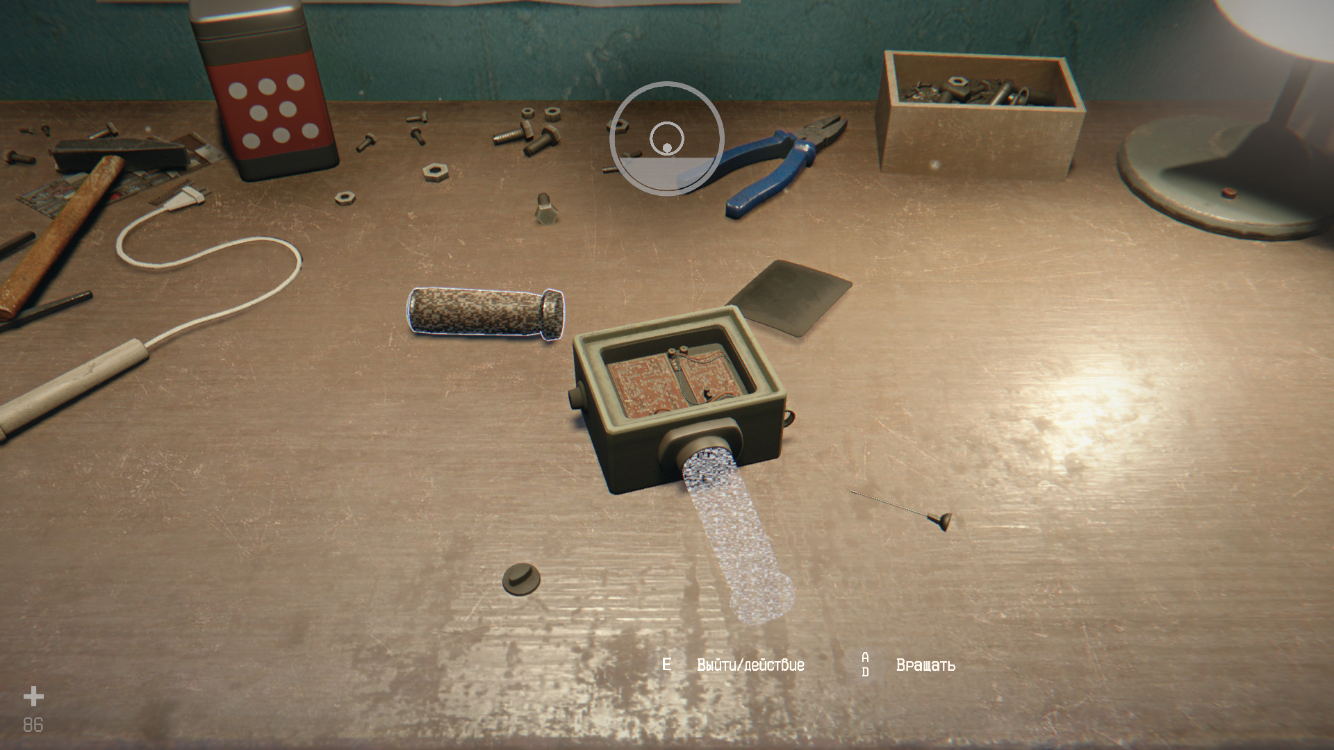 Войдите в мастерскую слева, осмотрите детектор на столе. Вставьте рукоять в большое круглое отверстие, в два отверстия поменьше установите антенну и тумблер. Поставьте сверху крышку. Для всего этого нужно сначала щелкать по детали, чтобы появилась линия, а после — по нужному отверстию на детекторе. Собрав устройство, обязательно его заберите.