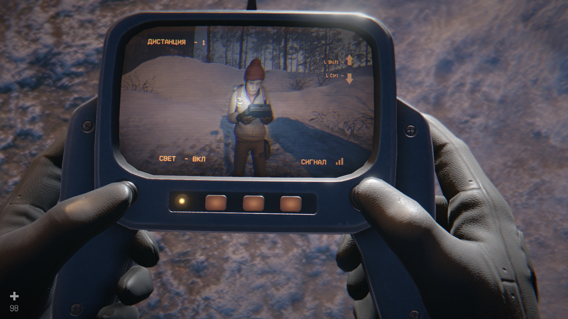Подлетите обратно к Игнату и обязательно заберите, а уже после садитесь в машину. Заведите автомобиль, езжайте вниз по склону, к табличке «Ретранслятор». Выйдите из машины и уберите красный шлагбаум. Продолжите движение по дороге.