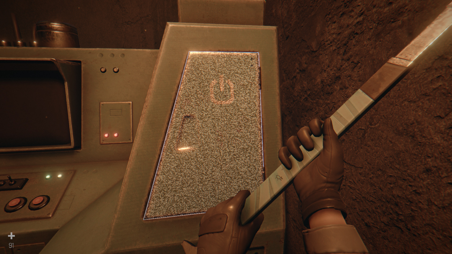 Идите по тропинке, экипируйте слесарный ключ и примените на доску. Перемещайте мышку справа налево, достаточно быстро, чтобы набралась полная шкала. Идите по туннелю и запрыгните в ретранслятор.