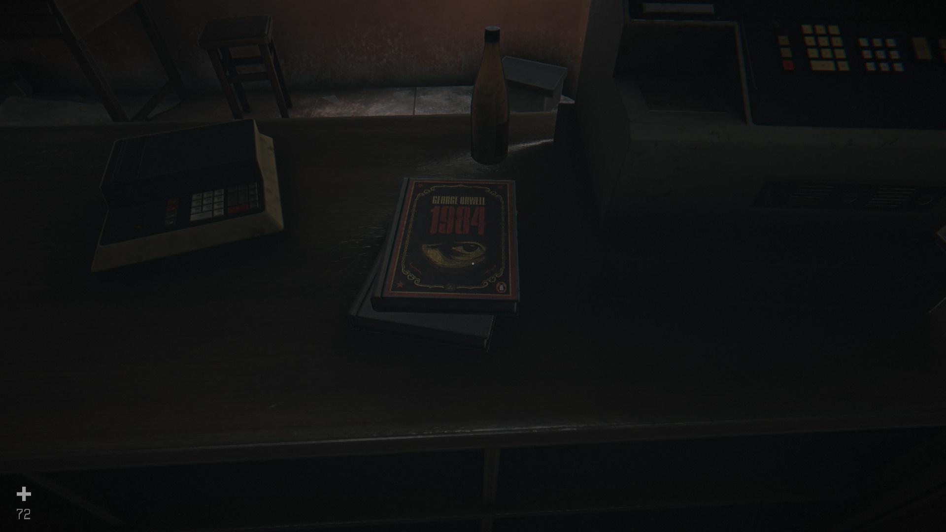 После кат-сцены вы окажетесь на заправке. Войдите внутрь, на прилавке ищите электронную книгу (5/30). В ней говорится про вещи из сейфа. Сам сейф стоит в небольшой комнате за прилавком. На полках прилавка можно найти батарею. На самом прилавке лежит книга с надписью 1984.