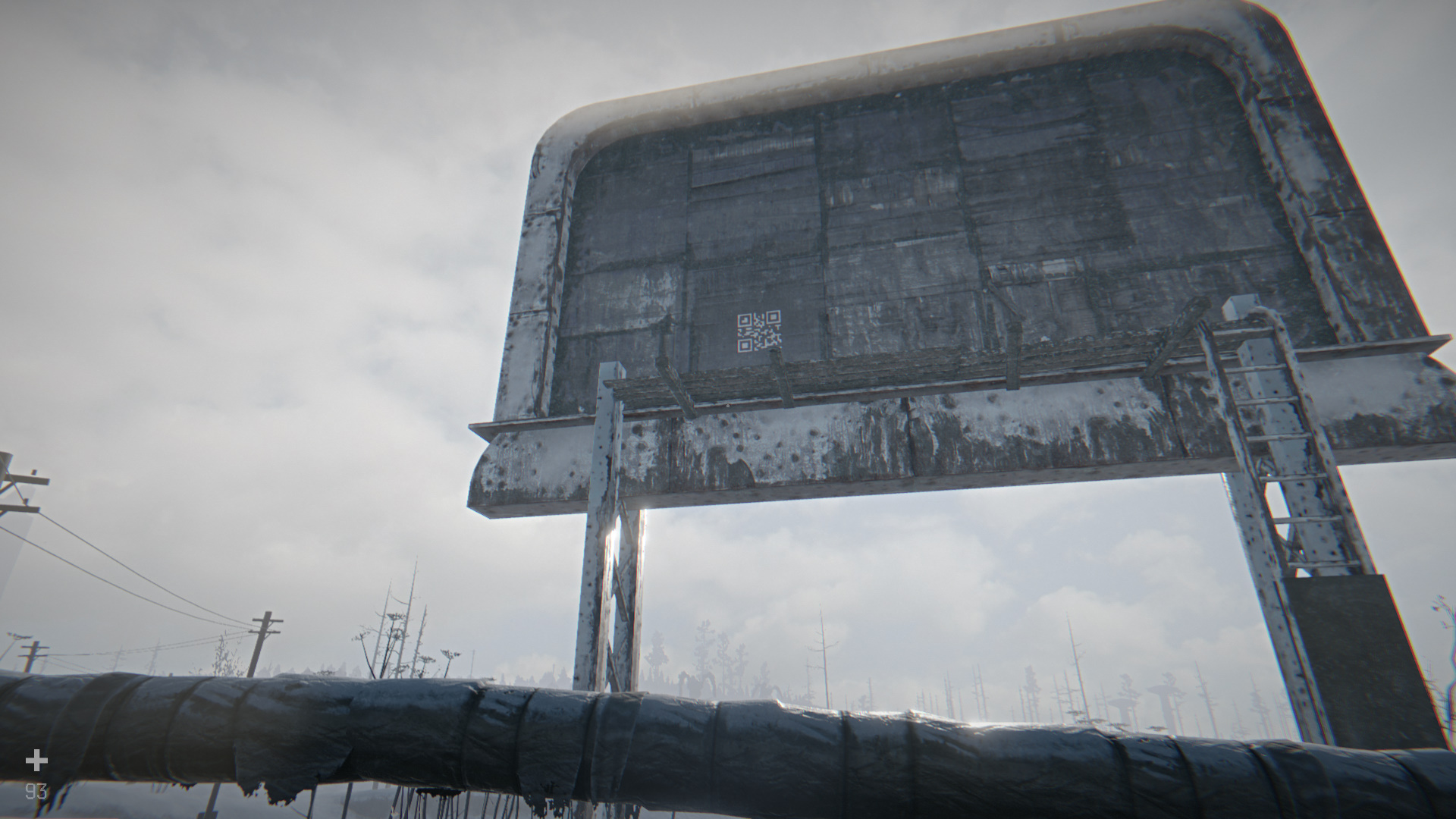 Езжайте в обратную сторону. Около упавших труб, мимо которых вы проехали ранее, стоит большой рекламный щит. Запустите к нему дрон и найдите QR-код, который можно отсканировать. Получите фотографию №3 для галереи.