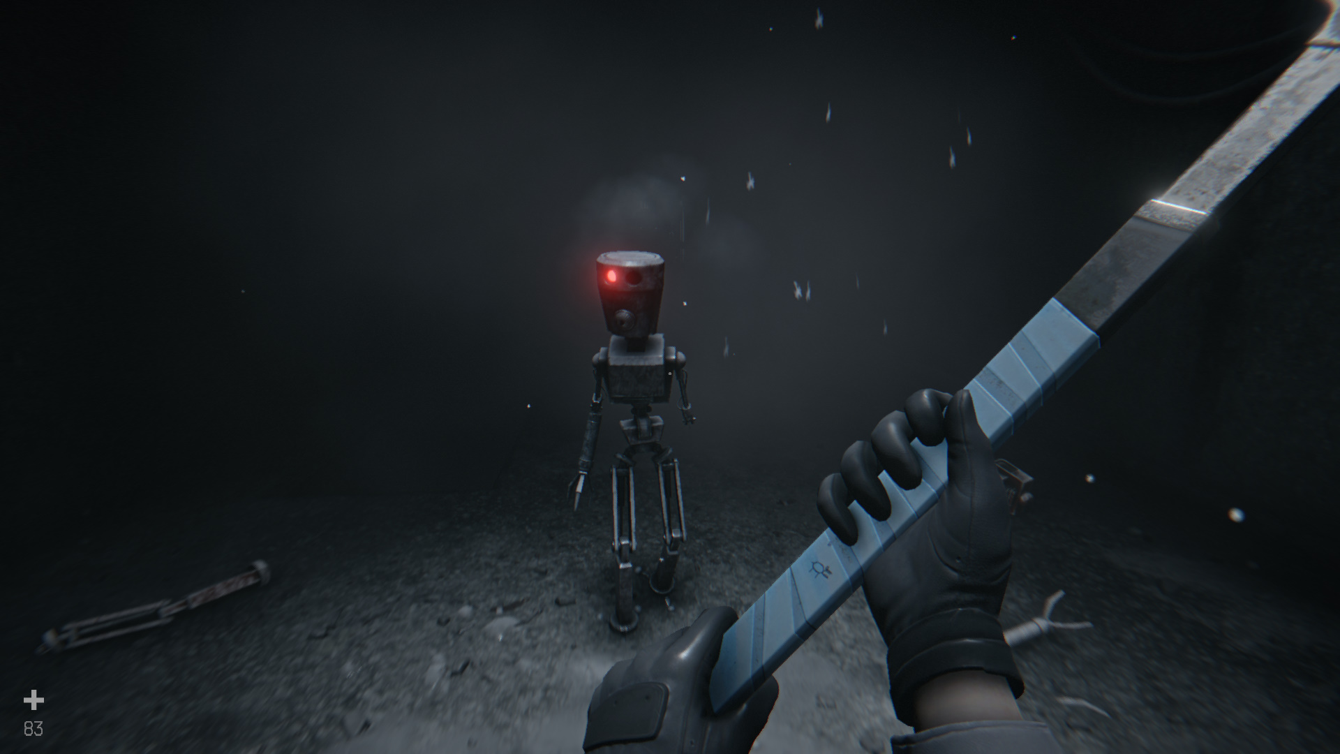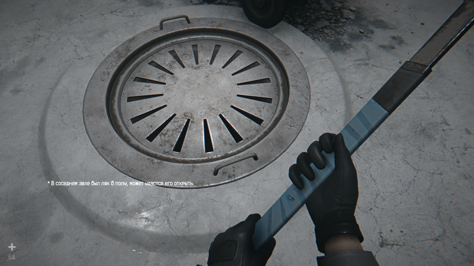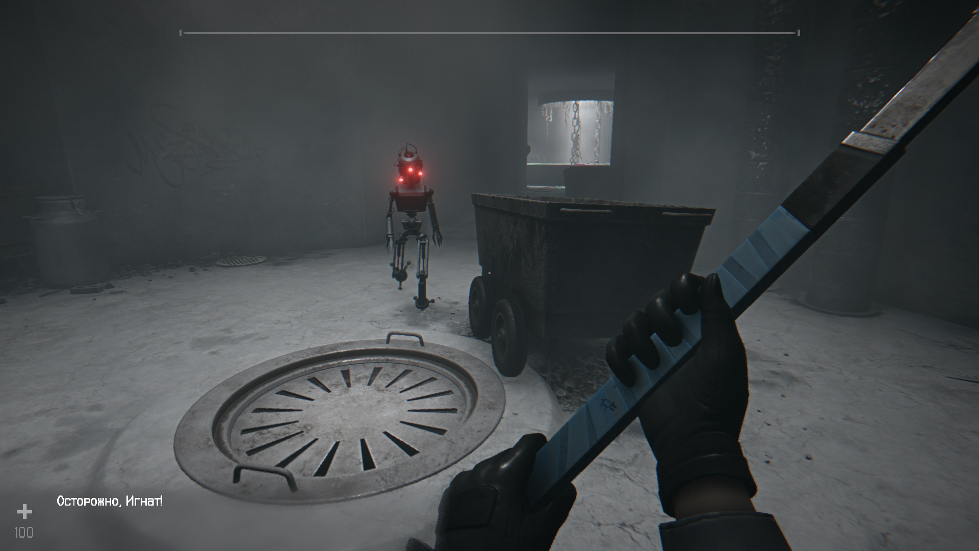Выйдите наружу, в коридоре появится бот-ремонтник. Шкала здоровья находится вверху экрана. Атакуйте, но не забывайте ставить блок на ПКМ. После победы пройдите к выходу, но ворота будут завалены. Идите назад в комнату с люком в полу. На стене неподалеку ищите квадратное отверстие. Вставьте в него металлический брусок и спрыгните в открывшийся люк.