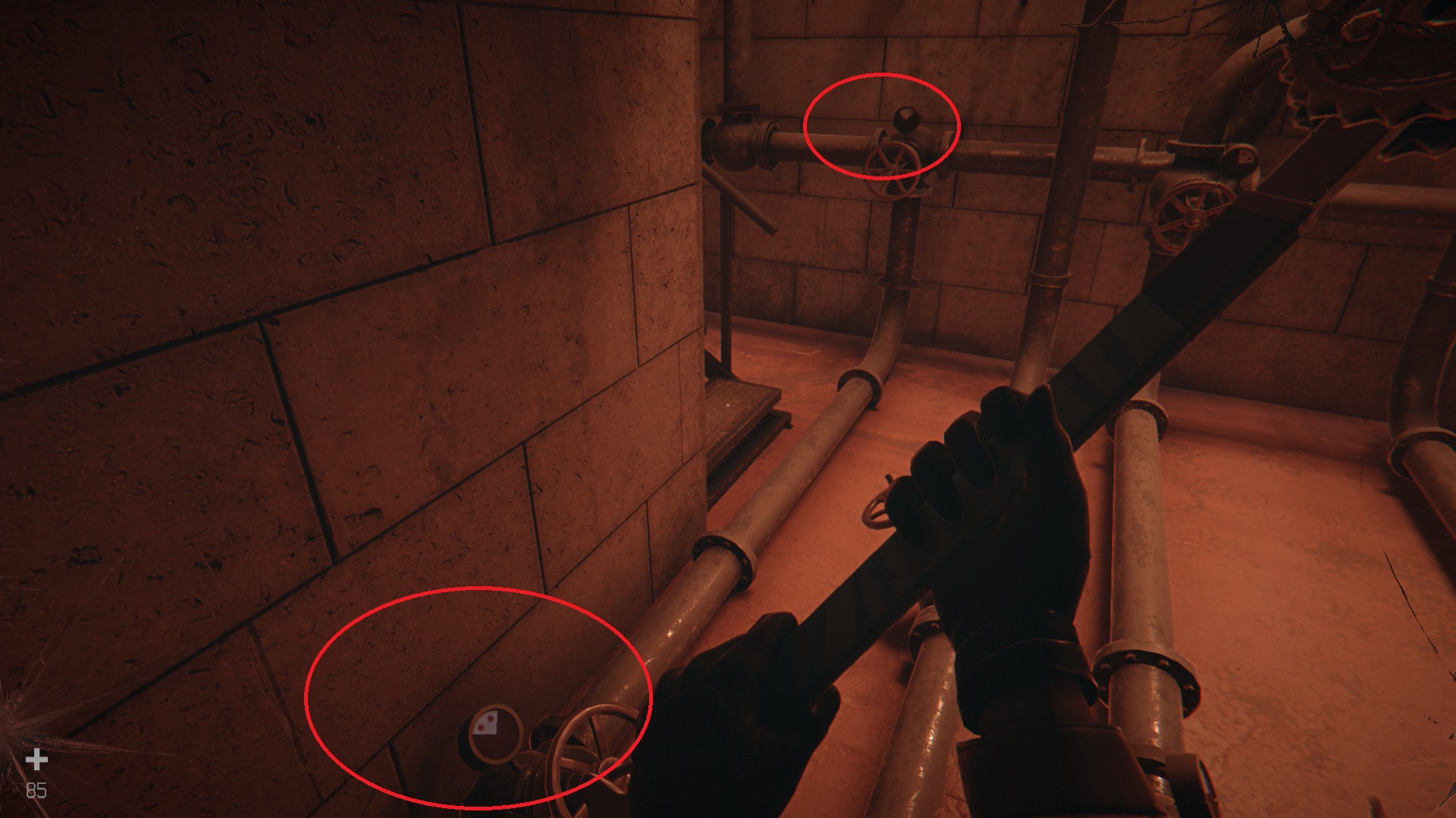 Вернитесь в самое начало и войдите в комнату с трубами и вентилями. Найдите на стене трубу, на которую указывает белая стрелка. Вода должна поступать исключительно в нее, а все остальные трубы нужно перекрыть. Сначала проследите, куда идет труба, и правильно настройте две связанных с ней вентиля. Тот, что рядом со стрелкой, слева, нужно настроить так, чтобы красная точка была справа внизу (а не вверху). Другой вентиль настройте так, чтобы были видны 2 красные точки.