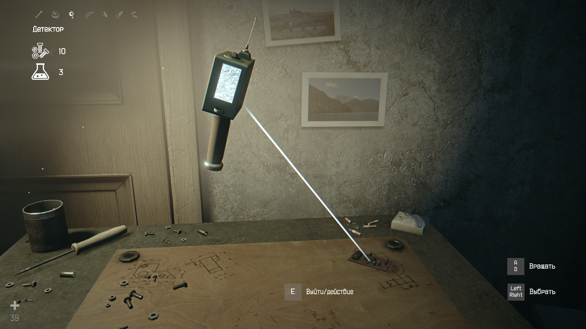 Вернитесь и откройте сейф кодом 2010. Заберите патроны и усилитель сигнала детектора. Следуйте к верстаку, переключитесь на детектор и установите сбоку усилитель. Теперь он будет работать на расстоянии 50 метров. Вы получите достижение «Далеко гляжу».