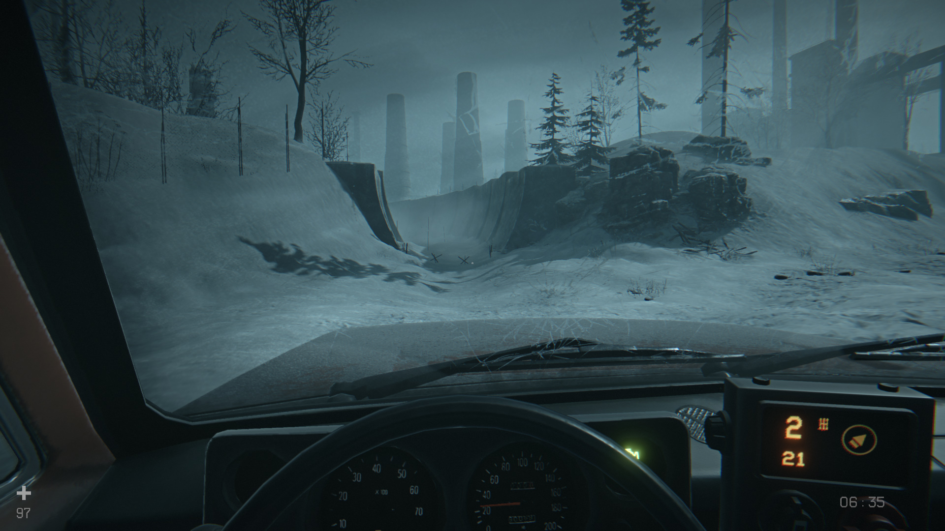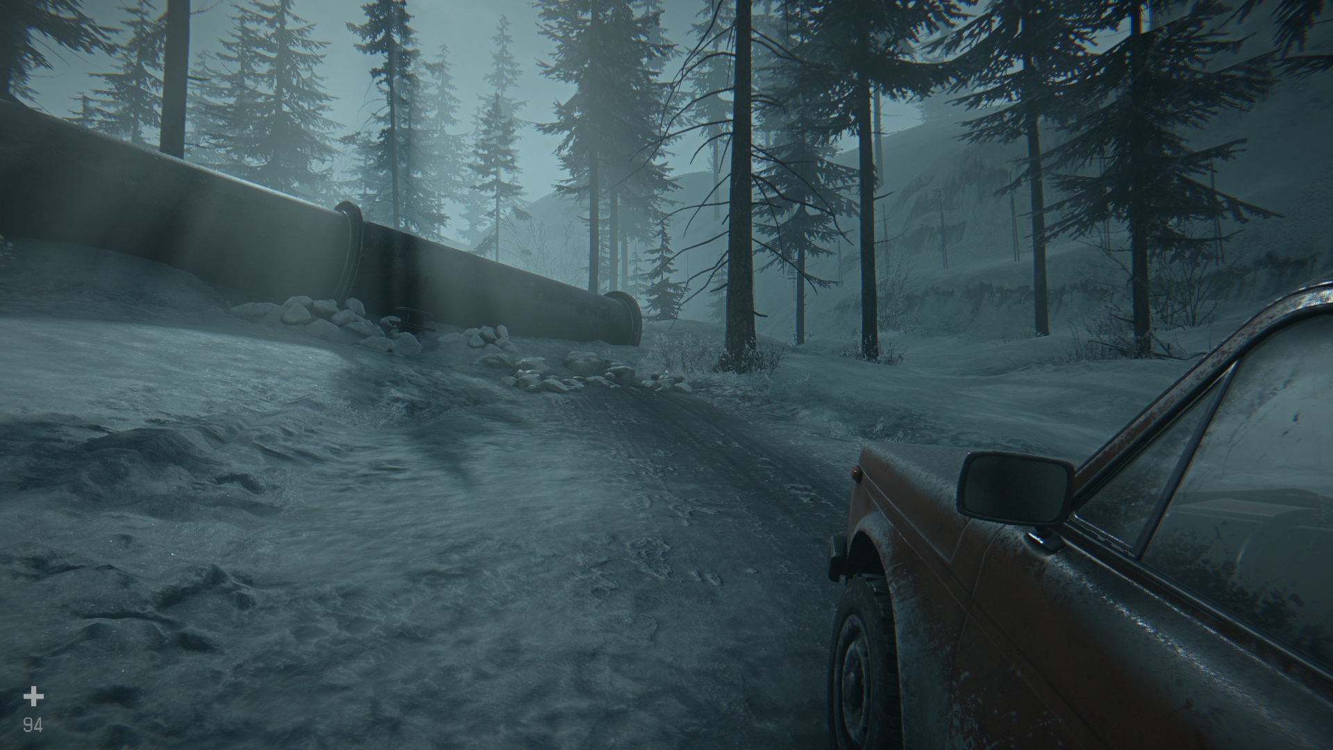 Продолжите движение на машине, объезжайте трубы и упавшие деревья.