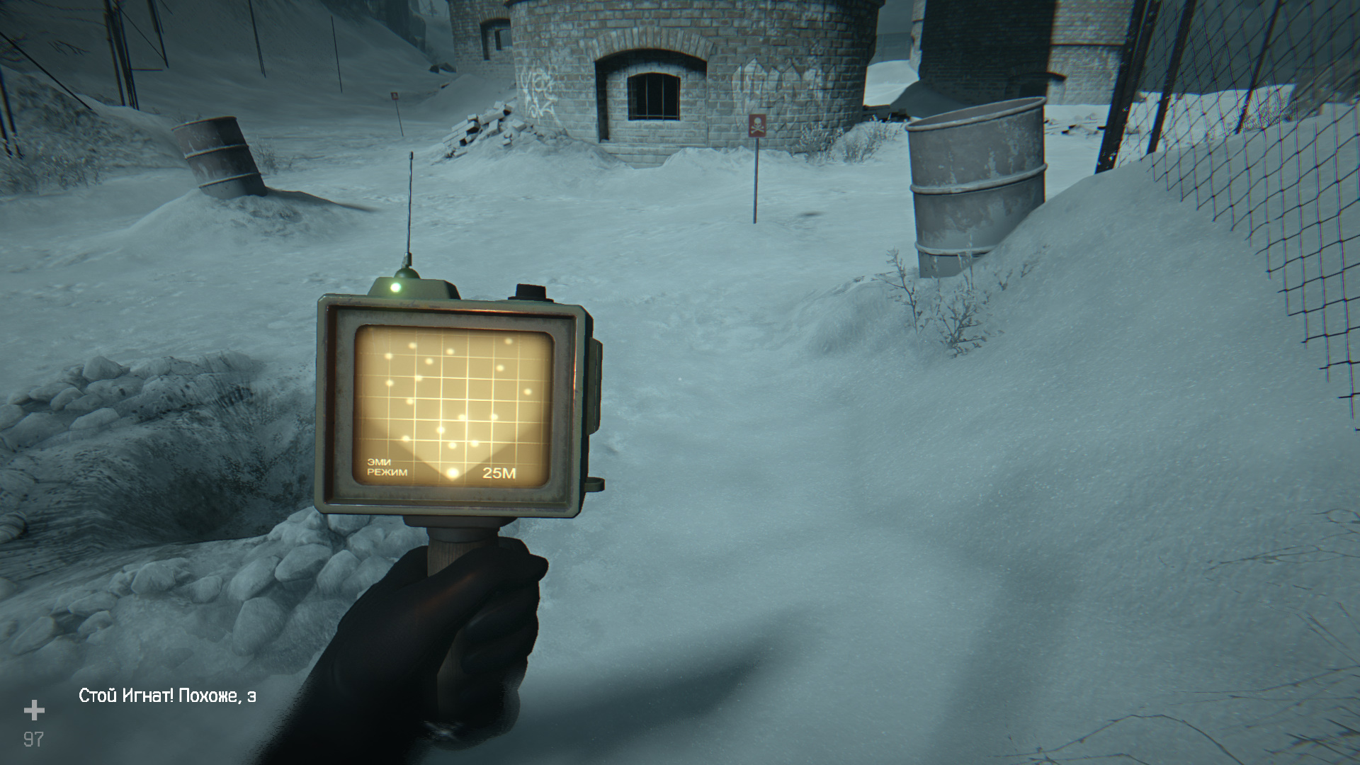 Выйдите наружу и идите в обратную сторону от ворот. Слева будет калитка Ш2. Пройдите за нее, достаньте детектор (клавиша «3») и ориентируйтесь по нему, чтобы пройти через минное поле.