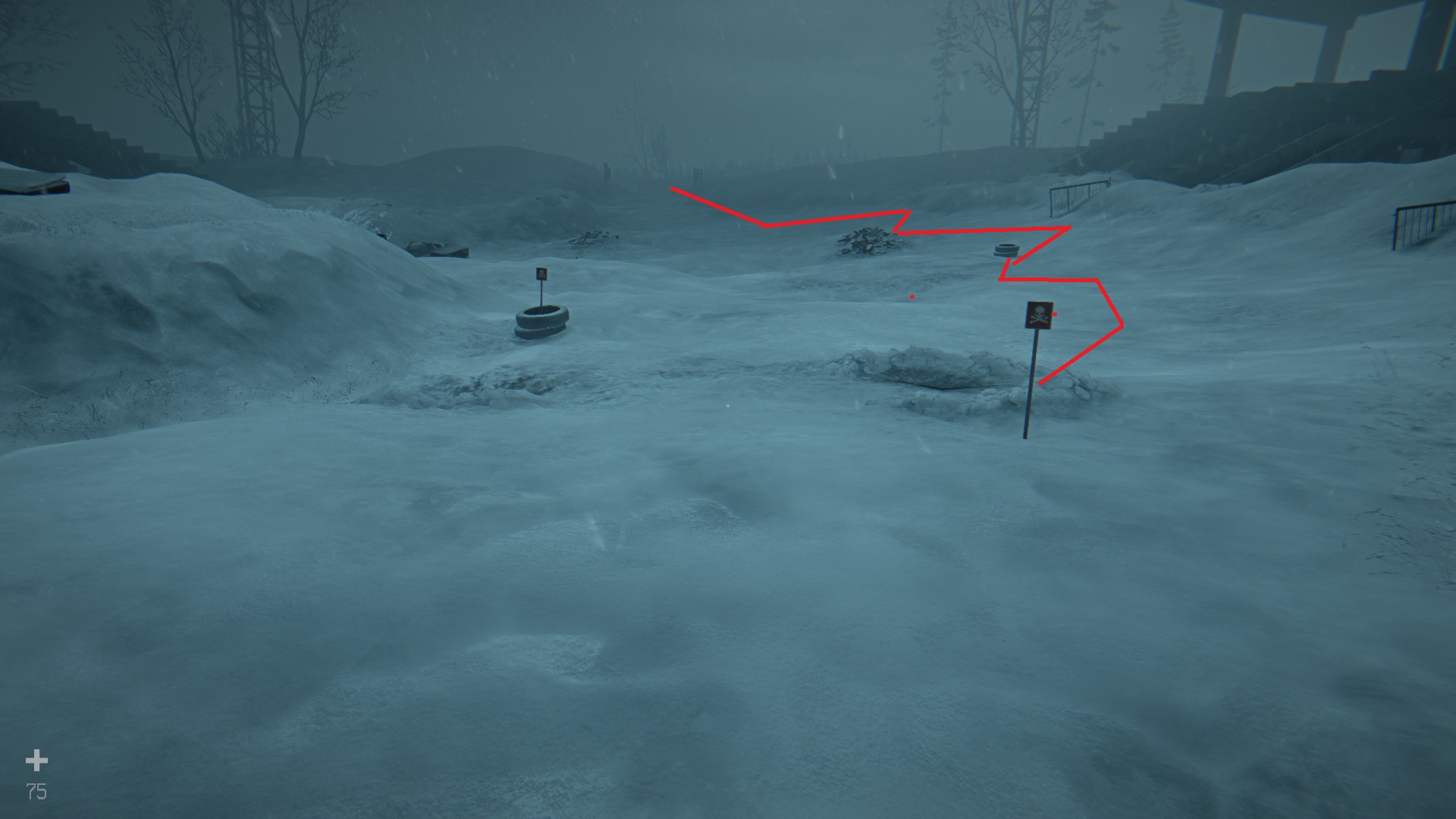 Вернитесь в машину и езжайте по дороге до стадиона «Восток». Здесь будет еще одно минное поле, но на этот раз преодолеть его нужно на машине. Найдите конусы и используйте их в качестве ориентира. Но можете воспользоваться нашим скриншотом, на котором мы отметили один из возможных безопасных маршрутов через поле на машине.