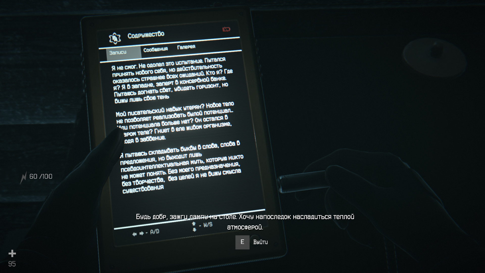 После нескольких фраз он попросит включить свет. Найдите на столе лампу и взаимодействуйте с ней. Главное — включить после просьбы. В таком случае вы получите достижение «Просьба».